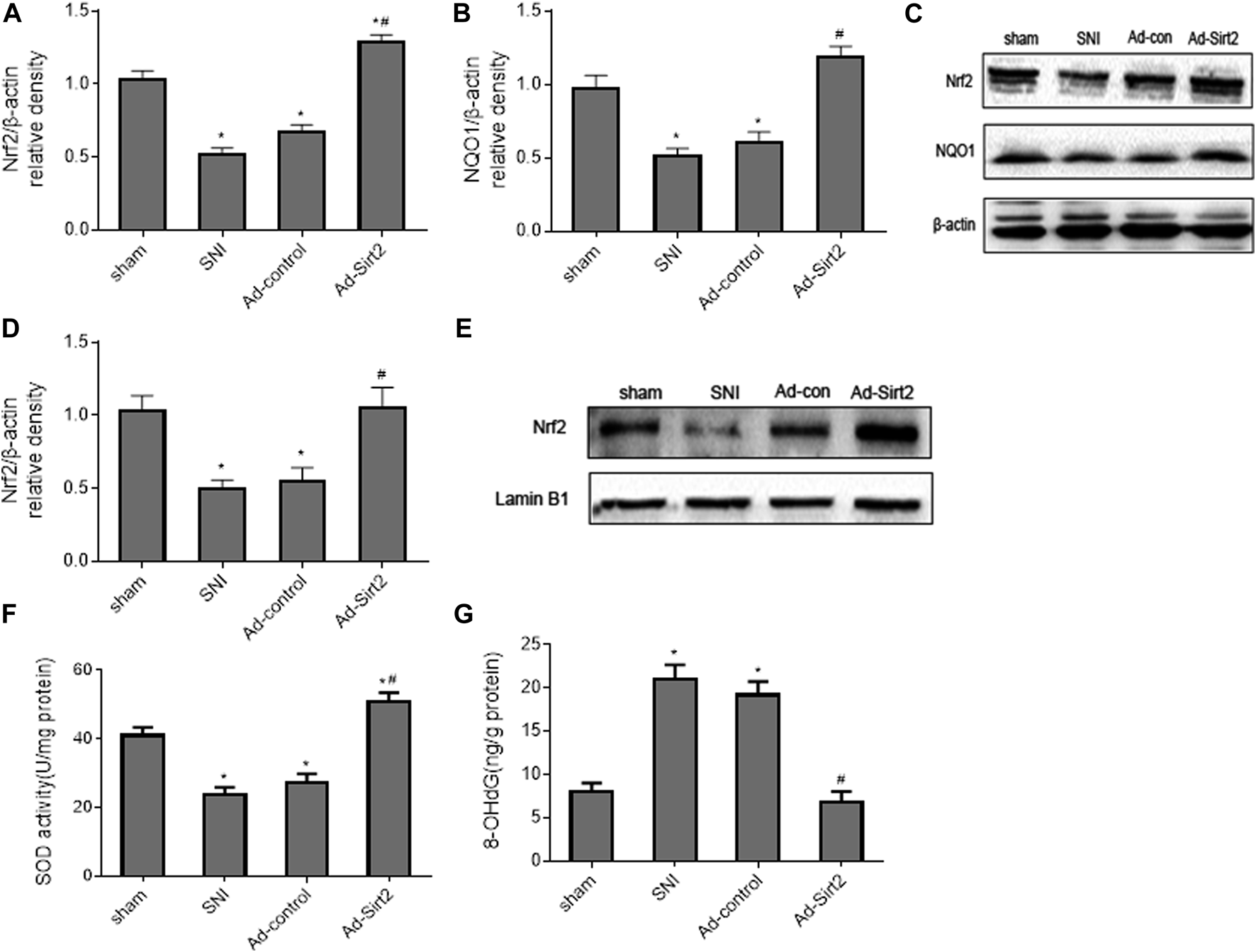 (A–C): Effects of intrathecal injection of Ad-Sirt2 or Ad-control on expression of Nrf2 and its downstream target NQO1 in the whole tissue lysates of the spinal cord in SNI rats. (D,E): Effects of intrathecal injection of Ad-Sirt2 or Ad-control on expression of Nrf2 in the nuclear fractions of the spinal cord in SNI rats. (F,G): Effects of intrathecal injection of Ad-Sirt2 or Ad-control on levels of antioxidant enzyme superoxide dismutase (SOD) and oxidative stress marker 8-hydroxy-2′-deoxyguanosine (8-OHdG) in the spinal cord of SNI rats. Sham rats without treatment served as control. Values are expressed as mean ± SE (n = 5 for each group). *p < 0.05 vs sham; #p < 0.05 vs SNI or Ad-control.