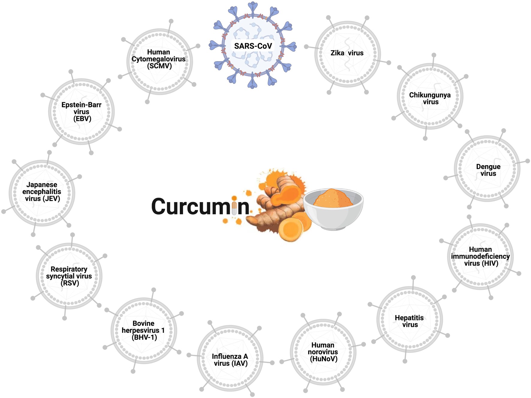 Antiviral effects of curcumin. Curcumin prevents cell infection and viral replication in the SARS-CoV, influenza A virus (IAV), zika virus, chikungunya virus, hepatitis C virus (HCV), human norovirus (HuNoV), viral hemorrhagic septicemia virus in fish (VHSV), bovine herpesvirus 1 (BHV-1), respiratory syncytial virus (RSV), Japanese encephalitis virus (JEV), Epstein-Barr virus (EBV), human cytomegalovirus (HCMV), and human immunodeficiency virus (HIV).