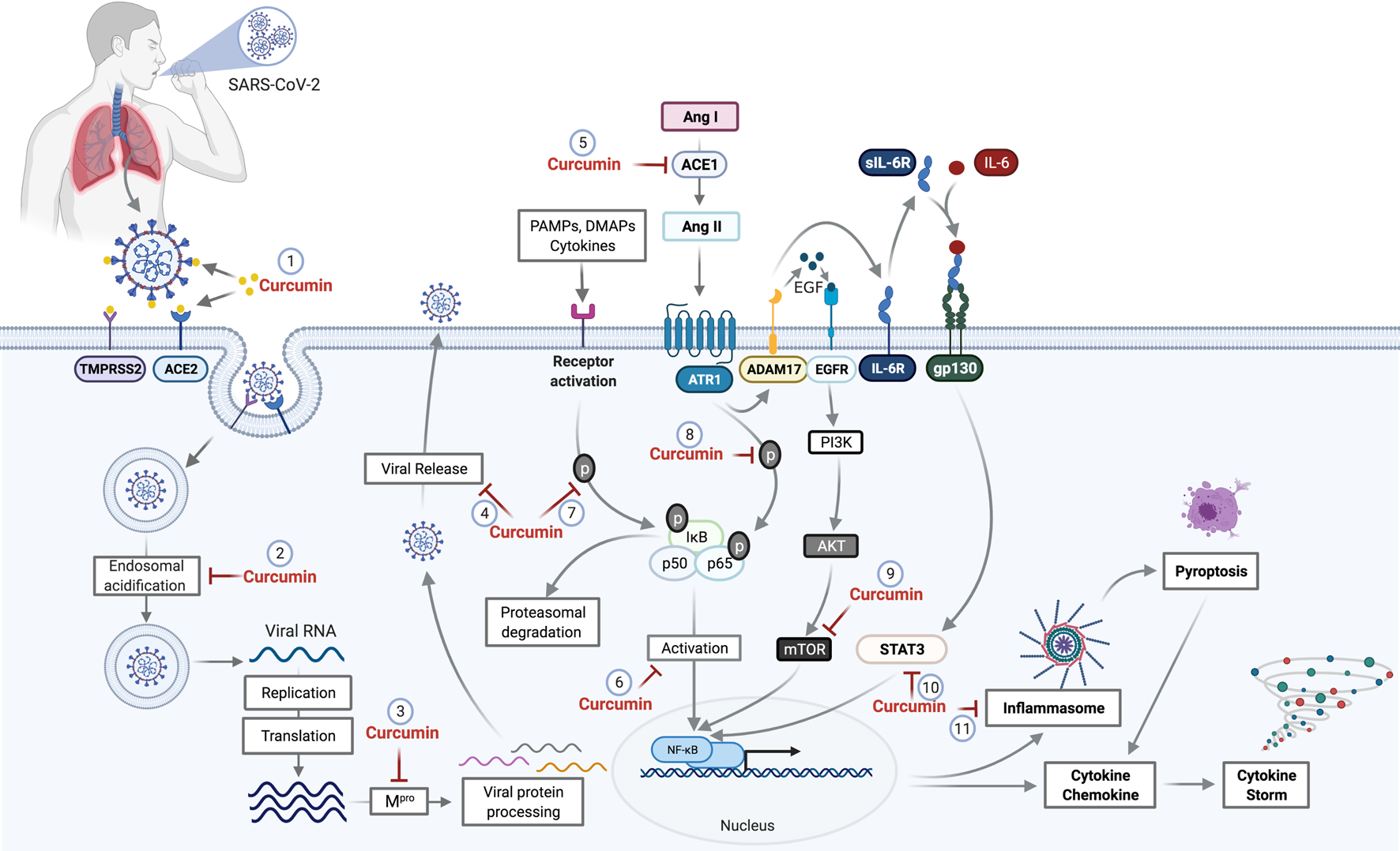 Potential curcumin targets as antiviral and anti-inflammatory in SARS-CoV-2 infection. The first antiviral effect of curcumin against SARS-CoV-2 is its potential for preventing the binding of viral S protein to the ACE2 receptor and initiate the host cell infection process (1). After penetrating the host cell via endosomes, the virus begins the replication process that requires an acid endosomal environment to initiate the proteolytic process of viral proteins and subsequent release to the external environment. Curcumin acts by inhibiting the Endosomal acidification (2) and processing of the viral proteins (Mpro), necessary for viral release (3,4). Further, the inhibition of ACE mediated by curcumin (5) prevents the increase of Ang II levels. Curcumin inhibits NF-κB (6) through the inhibition of different pathways. The binding of PAMPs, DAMPs, and cytokines that leads to IkB phosphorylation and proteasomal degradation is one of those pathways that cause NF-κB activation. Curcumin prevents both IkB phosphorylation and p65 subunit from the NF-κB (8), which consequently prevents NF-κB activation. The activation of ADAM17 by the AngII-ATR1 axis promotes the interaction between EGF and EGFR receptor, which promotes the activation of the PI3K/AKT/mTOR axis resulting in NF-κB activation. Curcumin acts as a potential inhibitor for mTOR (9), preventing the NF-κB pathway activation. ADAM17-mediated signaling also triggers the release of soluble interleukin 6-receptor, forming a complex with IL-6 (sIL-6R-IL-6) that binds to glycoprotein gp130. This complex binding (sIL-6R-IL-6+gp130) activates the signal transduction pathways responsible to induce the activators of transcription 3 (STAT3). Activation of STAT3 results in activation of NF-κB, which can be prevented by the curcumin (10). The NF-κB activation induces a protein complex formation, knowns as inflammasome, which can lead to cell death through pyroptosis, a pathway to cell death mediated by the activation of caspase-1. However, curcumin can cause the inhibition of inflammasome formation (11) by the inhibition of NF-κB. Abbreviations: TMPRSS2, transmembrane protease, serine 2; ACE1, angiotensin-converting enzyme 1; ACE2, angiotensin-converting enzyme 2; Mpro, main protease; PAMPs, pathogen-associated molecular pattern; DAMPs, damage-associated molecular patterns; ANG I, angiotensin I; Ang II, angiotensin II; ATR1, angiotensin II (AII) receptor 1; ADAM17, a disintegrin and metalloproteinase 17; EGF, epidermal growth factor; EGFR, epidermal growth factor receptor; IL-6R, interleukin 6 receptor; sIL-6R, soluble Interleukin 6 receptor; gp130, glycoprotein 130; PI3K, phosphoinositide 3-kinase; AKT, protein kinase B; mTOR, mammalian target of rapamycin; STAT3, signal transducers and activators of transcription; NF-κB, factor nuclear kappa B.