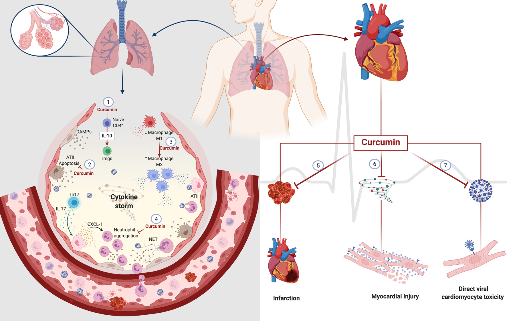 Potential curcumin in cell damage caused by SARS-CoV-2 in the lung and heart. Curcumin promotes differentiation from naïve CD4+T-cell to Tregs through the modulation of IL-10 (1). The cytoprotective role of curcumin decreases the death of type II alveolar cells (ATII) with a consequent decrease in the release of DAMPs (2). Curcumin also mediates macrophages' polarization, decreasing the population of inflammatory macrophages M1 to macrophages M2 that participate in the resolving and reparative process (3). The presence of Th17 cells promotes the activation of ATII cells through IL-17. In turn, activated ATII cells release a chemoattractant for neutrophils that causes neutrophil aggregation. Curcumin decreases IL-17 levels with a consequent decrease in neutrophil aggregates. The anticoagulant and antithrombotic effects of curcumin can have protective effects on the heart, decreasing the heart attack risk (5). The anti-inflammatory action of curcumin can prevent damage to cardiomyocytes caused by an excess of inflammatory mediators, known as a cytokine storm (6). Its affinity for protein S and ACE2 can prevent the direct infection of cardiomyocytes by SARS-CoV-2 (7). Abbreviations: ATII, alveolar type II cells; Tregs, regulatory T cells; Th17, T helper 17 cells; CXCL-1, chemokine ligand 1; NET, neutrophil extracellular traps.