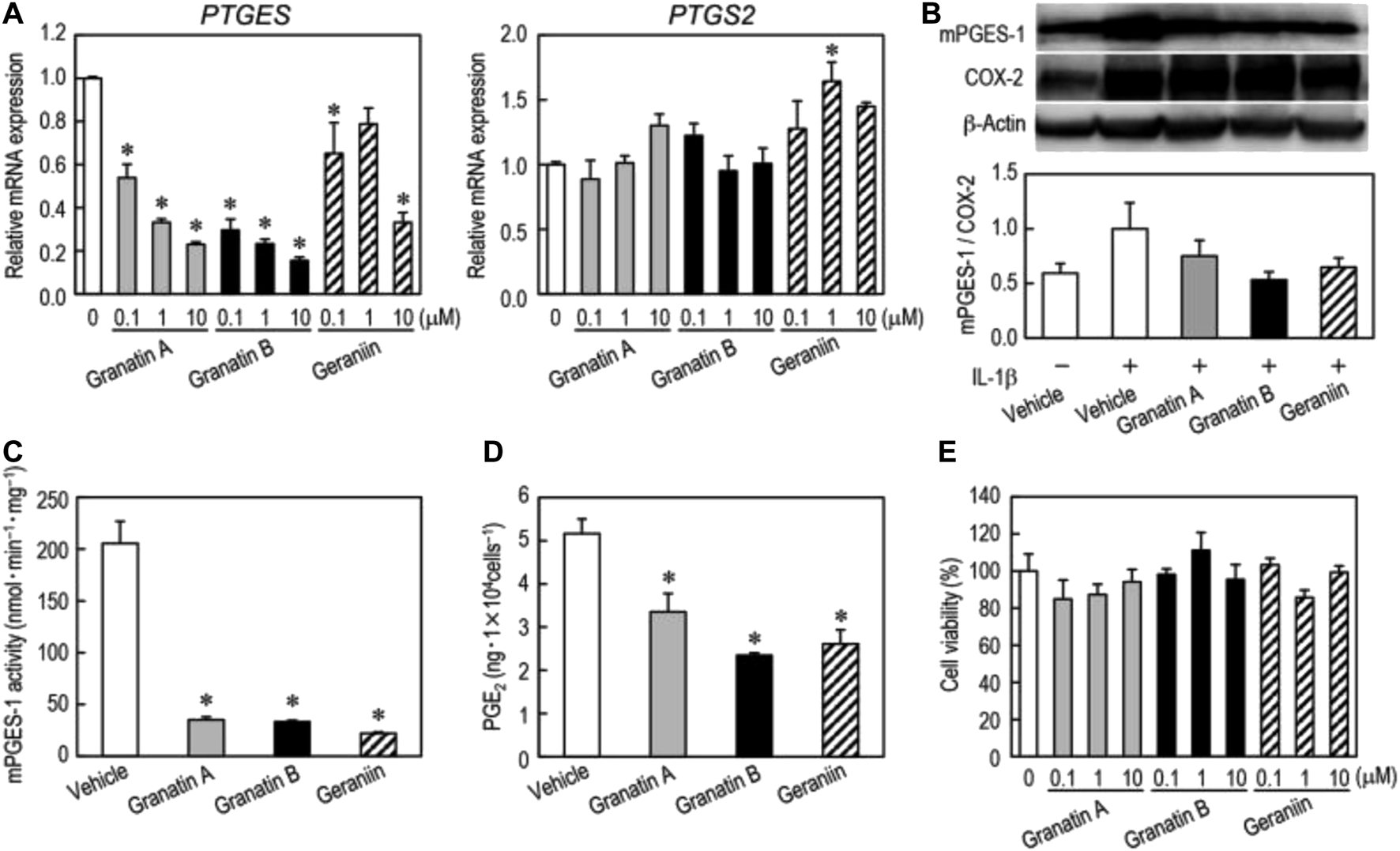 Effects of granatin A, granatin B, and geraniin on mPGES-1 and COX-2 expression. Changes in mRNA and protein levels of mPGES-1 and COX-2 by treatment with granatin A, granatin B, and geraniin were analyzed by real-time PCR and western blotting. Reproduced from Toda et al., 2020 with permission from Taylor and Francis Ltd. Copyright 2019.