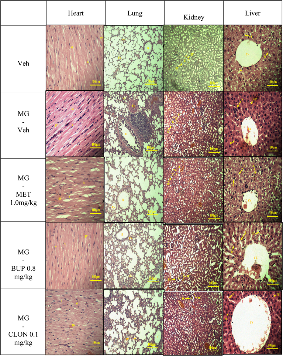 On day 5, animal tissue samples of targeted organs (heart, lung, kidney, liver) were harvested after behavioural testing. The tissues were stained using Hematoxylin and Eosin. Then, the slides were viewed under light microscope equipped with a digital camera. The sections were analysed for structural changes, degenerative alterations, necrosis and signs of inflammation.
