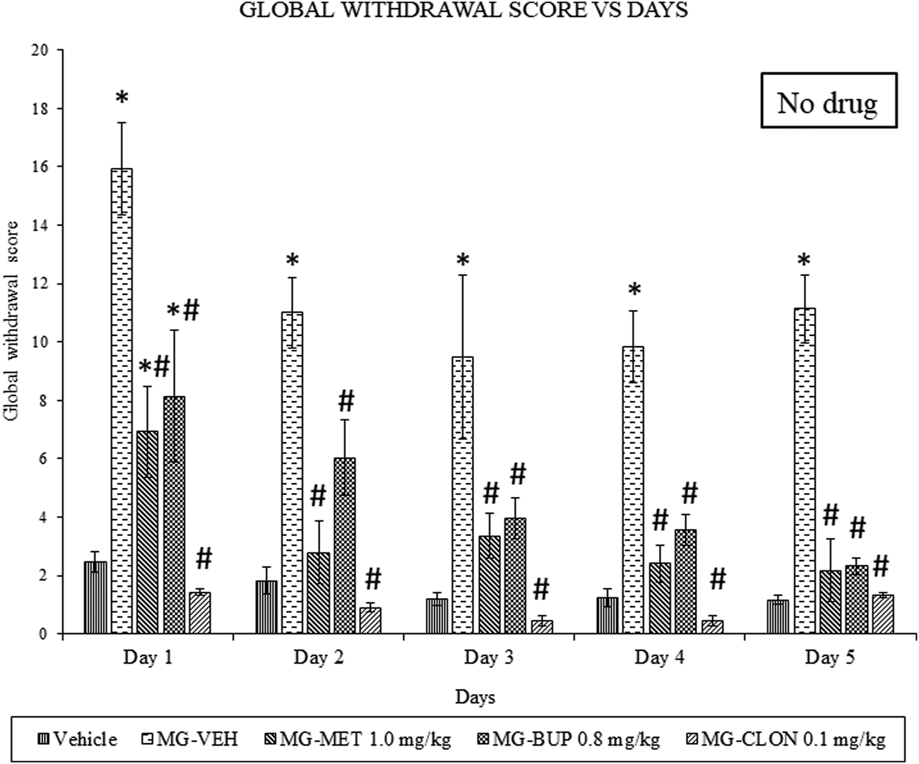 Methadone (MET), Buprenorphine (BUP) and Clonidine (CLON) reduced behavioural signs of mitragynine withdrawal in rats. Data represent means (±SEM) of global withdrawal signs (n = 6/group; *p < 0.05, vs. Vehicle, #p < 0.05 vs. mitragynine-vehicle, MG-VEH).