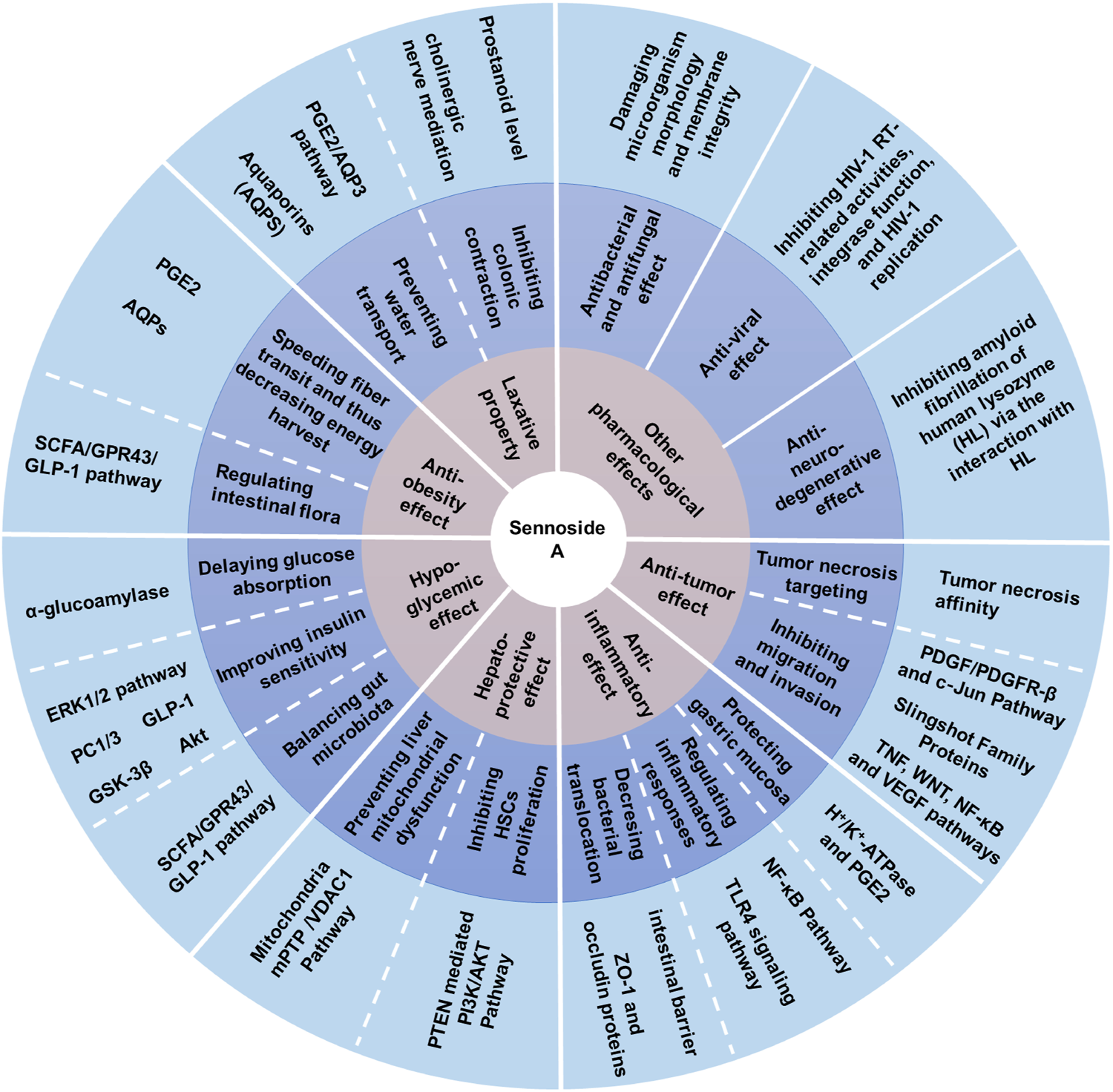 Pharmacological activities of sennoside A. SA has many potential pharmacological benefits, including laxative, anti-obesity, hypoglycemic, hepatoprotective, anti-inflammatory, anti-tumor, anti-bacterial, antifungal, anti-viral and anti-neurodegenerative effects.