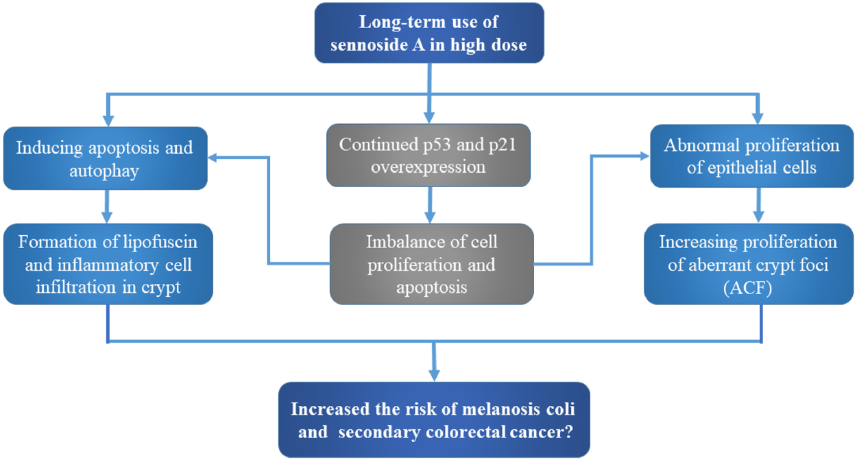 The imbalance of cell proliferation and apoptosis is related to the process of carcinogenesis. Persistent overexpression of p53, a key protein to induce cell cycle arrest and apoptosis, could lead to the increased risk of colorectal cancer (Kastan et al., 1991; Chen et al., 1995; Nakayama and Oshima, 2019). van Gorkom et al. discovered that the apoptosis induced by short-term use of sennosides (2 mg/kg SA and SB) might be mediated through the p53-p21/WAF pathway. Although the colonic self-repair damage induced by a single high-dose sennoside laxative, long-term use of sennoside laxative would lead to constant overexpression of p53 and p21, which might lead to increased risk of colorectal cancer (van Gorkom et al., 2001).