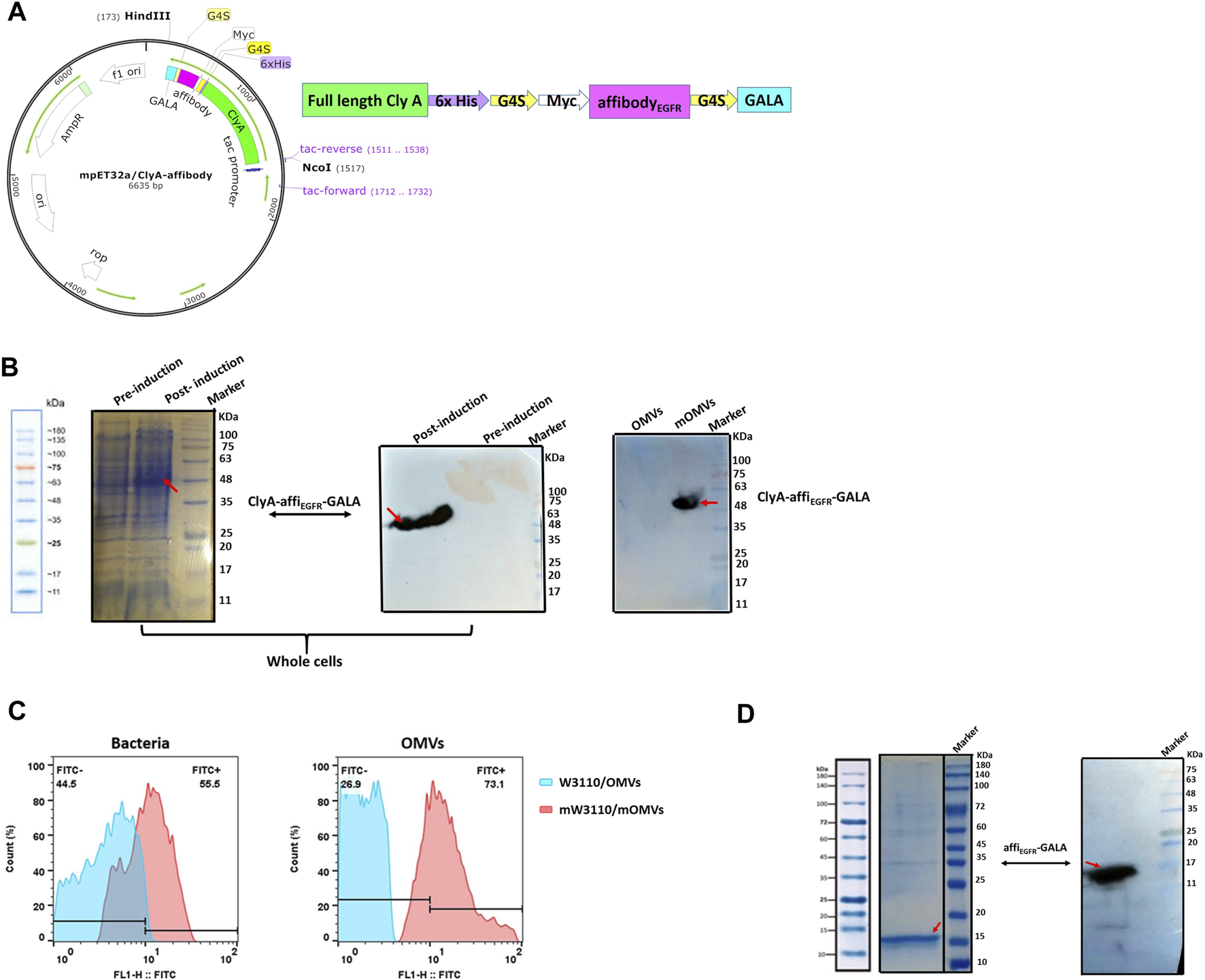 Protein expression analysis. (A) Schematic diagram of ClyA-affiEGFR-GALA construct. The orientation of fragments used in the construct has been shown. (B) Expression of the ClyA-affiEGFR-GALA fusion protein was evaluated in ∆msbB/∆pagP W3110 using 10% SDS-PAGE and Western blotting in total bacterial protein samples (left and middle) and the engineered OMVs (right) (mOMVs: modified OMVs). (C) Immune fluorescence analysis of the location of ClyA-affiEGFR-GALA. ∆msbB/∆pagP W3110 cells and their derived OMVs were surface stained using an anti-affibody antibody. (D) 12% SDS-PAGE (left) and Western blotting (right) of the purified affiEGFR-GALA in BL21 (DE3).