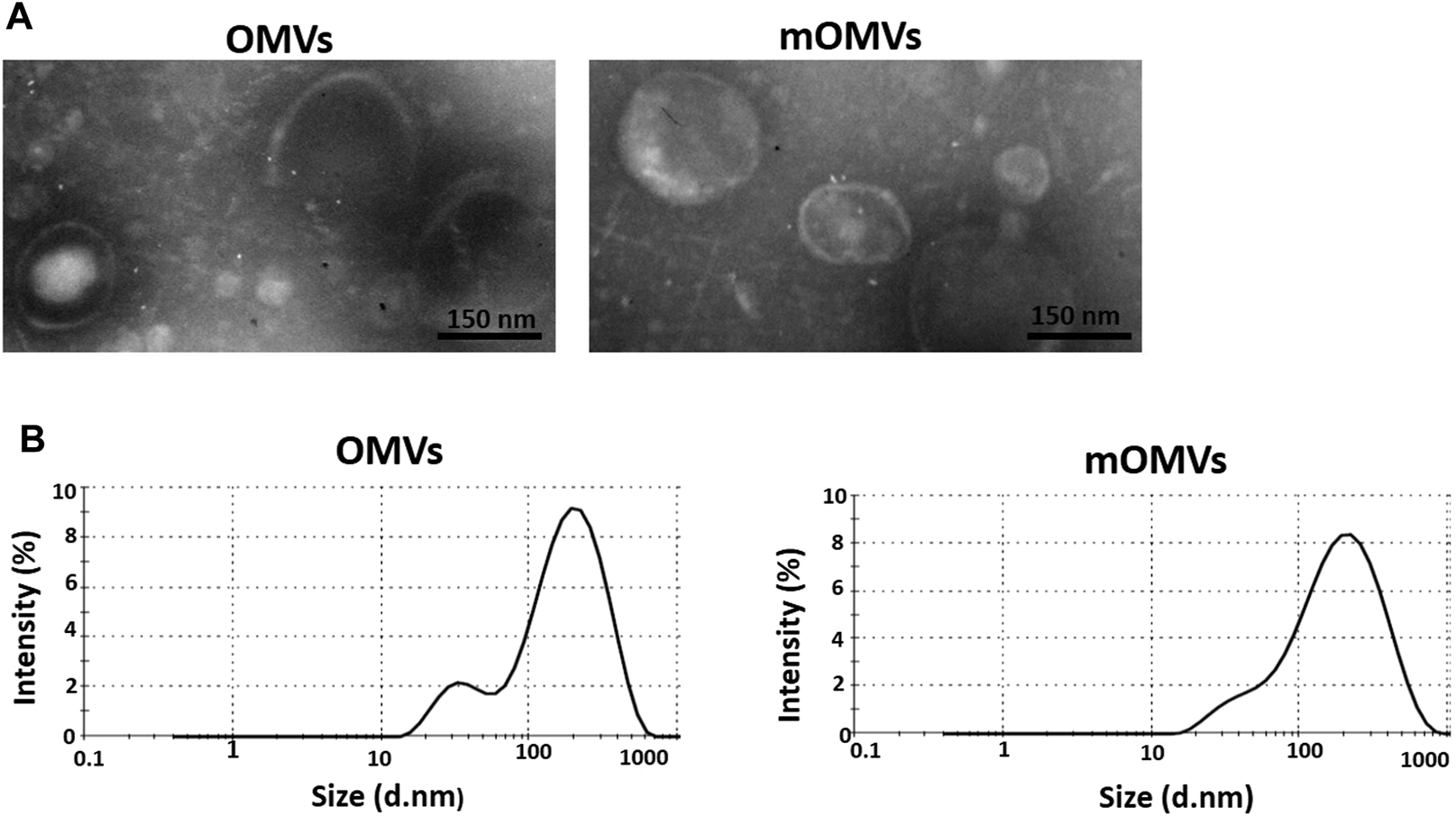 Characterizing the engineered OMVs. (A) Transmission electron microscopic observation of the OMVs (left) and modified OMVs (mOMVs) (right). The bar indicates 150 nm. (B) Dynamic light scattering confirmed the size distribution of OMVs.