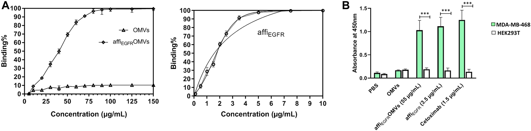 Binding capacity of the OMVs, affiEGFR-OMVs, and affiEGFR to EGFR protein was assessed using ELISA. (A) AffiEGFR-OMVs and the purified affiEGFR attach to EGFR protein, while no EGFR binding is observed for non-targeted OMVs even at the highest concentration. (B) AffiEGFR-OMVs and the purified affiEGFR specifically bind to the MDA-MB-468 cells expressing EGFR. Cetuximab was applied as a positive control for EGFR-specific binding. OMVs and the purified protein were explored by consecutive incubation with anti-affibody antibody and HRP- conjugated rabbit anti-goat IgG. Data are expressed as the mean ± SEM from three independent experiments (***p < 0.001).