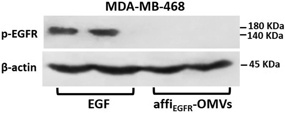 To detect expression of EGFR in MDA-MB-468 and HEK293T cells, the cells were seeded at 2.5×105 in 6 well plates and incubated at the standard growth culture for 24 h. For the EGFR stimulation test, MDA-MB-468 cells were plated and treated with affiEGFR-OMVs (250 μg/ml) or EGF (100 nM) on the next day following overnight serum starvation. The cells were then lysed using RIPA lysis buffer (Sigma-Aldrich) containing protease inhibitors. The protein concentration was determined using the Bradford protein assay and protein samples were separated by 10% SDS-PAGE electrophoresis. Western blotting analysis was then performed as described before. Images were quantified using the ImageJ 1.4.3.67 (NIH software). The protein content was normalized to the level of β-actin. The antibodies used were as follows: EGFR (1/1,000, orb225296, Biorbyt, United Kingdom), p-EGFR (1/200, SC-81488, Santa Cruz Biotechnology, United States) and β-actin (1/1,000, 4967S, Cell Signaling, United States).