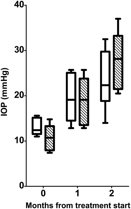 Longitudinal analysis of IOP levels in D2 (white boxes) and D2+LG (dashed boxes). Box plots describe the statistical distribution of data deriving from the average of IOPs measured in individual right and left eyes of n = 6 mice. Statistical differences were tested using two-way ANOVA with Bonferroni post-hoc test. The effect of time was highly significant (p < 0.0001), while the effect of LG at each time was not significant (p = 0.6782).
