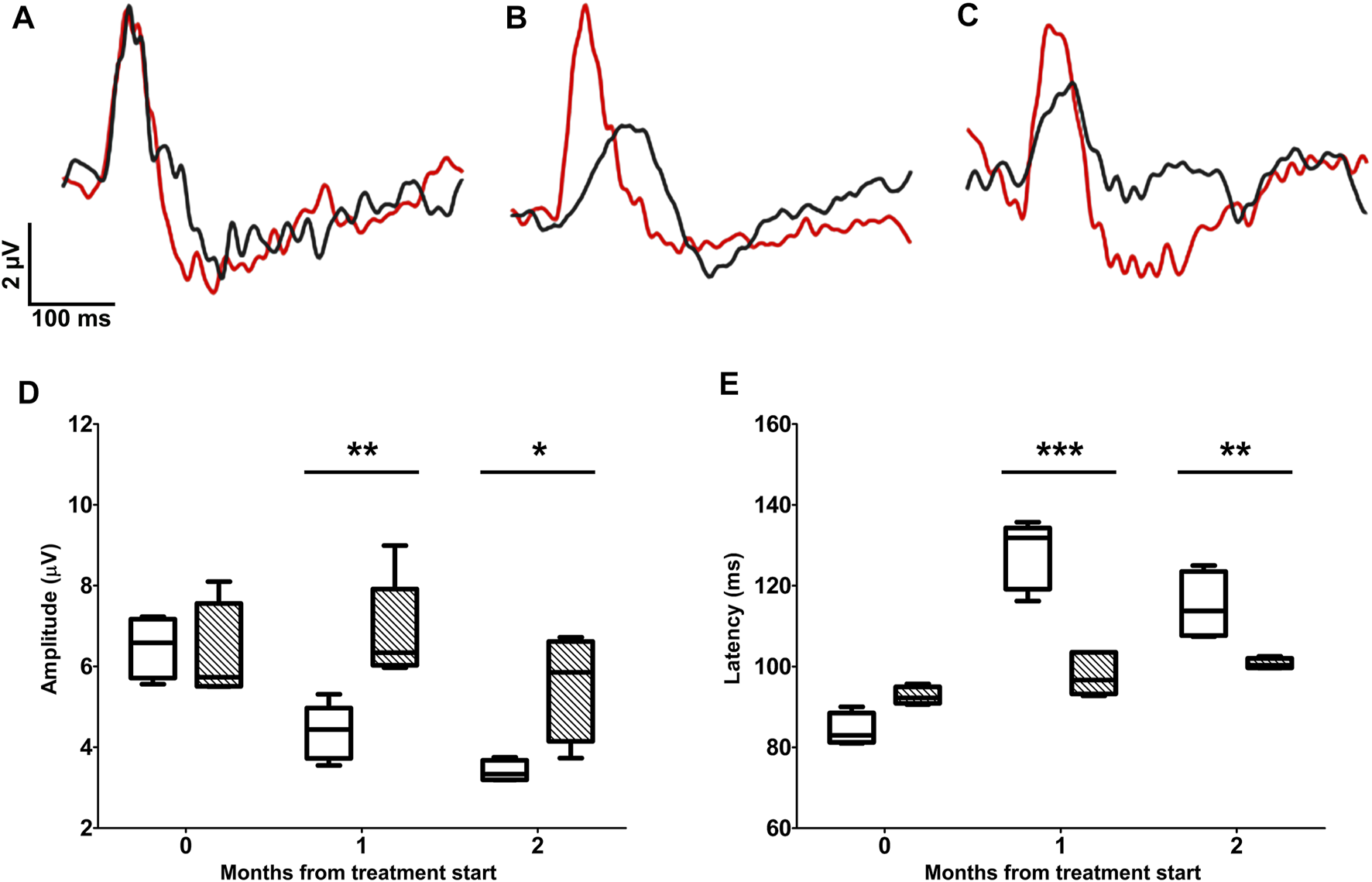 Longitudinal evaluation of RGC activity using PERG. PERG responses were recorded before the beginning of the treatment (A) and after 1 (B) or 2 (C) months of treatment in D2 (black traces) and D2+LG (red traces) mice. PERG responses were analyzed by retrieving the peak-to-trough amplitude and time-to-peak latency, as shown in the inset in (A). The distribution of PERG amplitudes (D) and PERG latencies (E) in D2 (white boxes) and D2+LG (dashed boxes) deriving from n = 6 mice are shown by box plots. Statistical differences were tested using two-way ANOVA with Bonferroni post-hoc test. *p < 0.05, **p < 0.01, ***p < 0.001.