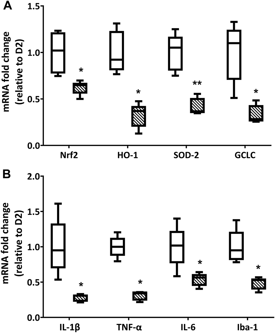 Endpoint qPCR analysis for the expression of oxidative stress (A) and inflammation-related (B) markers in D2 (white box) and D2+LG (dashed boxes) groups after 2 mo of treatment. Box plots describe the statistical distribution of n = 6 independent retinas. Differences between groups were tested using two-tailed t-test. *p < 0.05, **p < 0.01 vs D2.