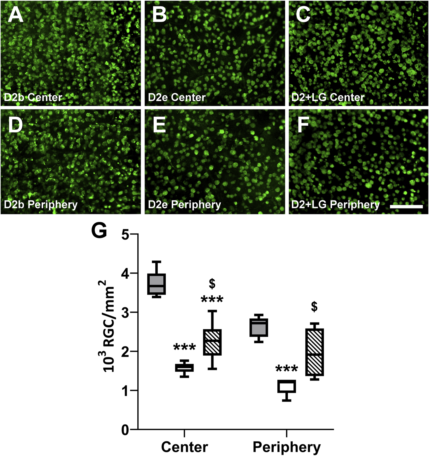 Baseline and endpoint densitometric analysis of RBPMS-immunostained RGCs in whole mount retinas. Immunofluorescence photomicrographs show representative RBPMS immunostaining in central and peripheral areas of D2b, (A,D), D2e (B,E) and D2+LG (C,F) retinas. Scale bar, 100 µm. (G) analysis of RBPMS positive cell density in D2b (gray boxes), D2e (white boxes), and D2+LG (dashed boxes) retinas. Box plots describe the statistical distribution of n = 4 independent retinas. Data were analyzed using two-way ANOVA with Bonferroni post-hoc test. *p < 0.05 vs D2.
