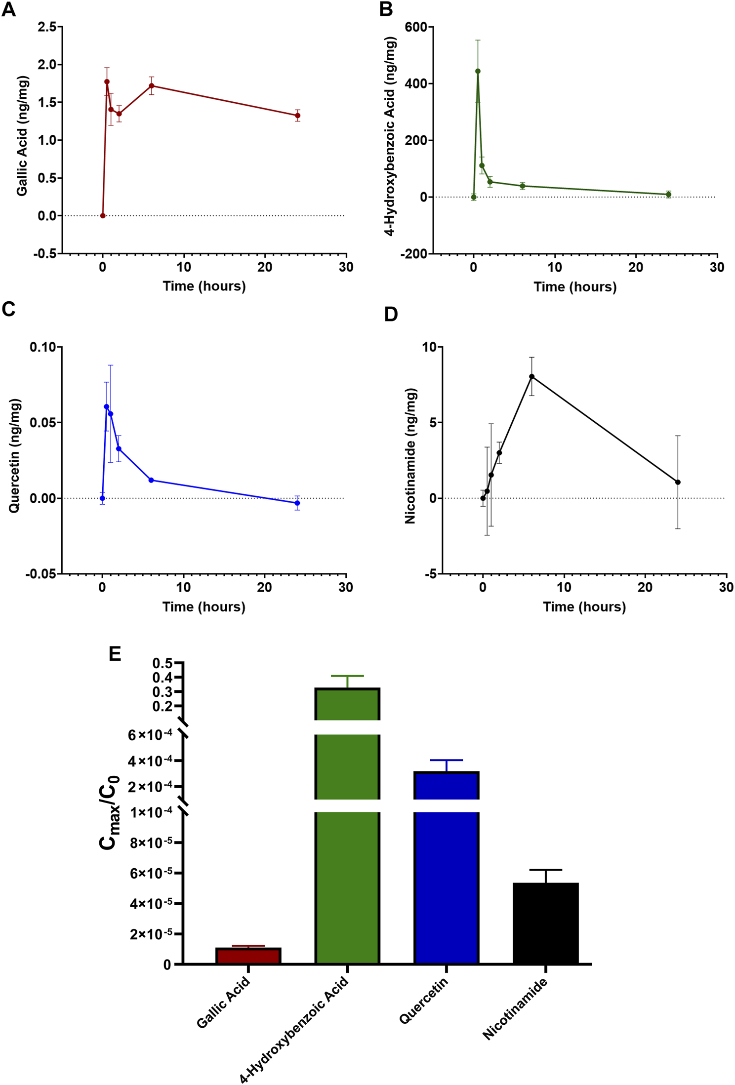 Time-dependent retinal profile of gallic acid (A), 4-hydroxybenzoic acid (B), quercetin (C), and nicotinamide (D) amount after administration of 1 mg LG by oral gavage. (E) corresponding ratios calculated as the maximal amount of each compound reaching the retina (Cmax) divided by the initial amount of the same compound administered in 1 mg of LG (C0). Data are expressed as mean ± SEM of n = 3 independent samples.