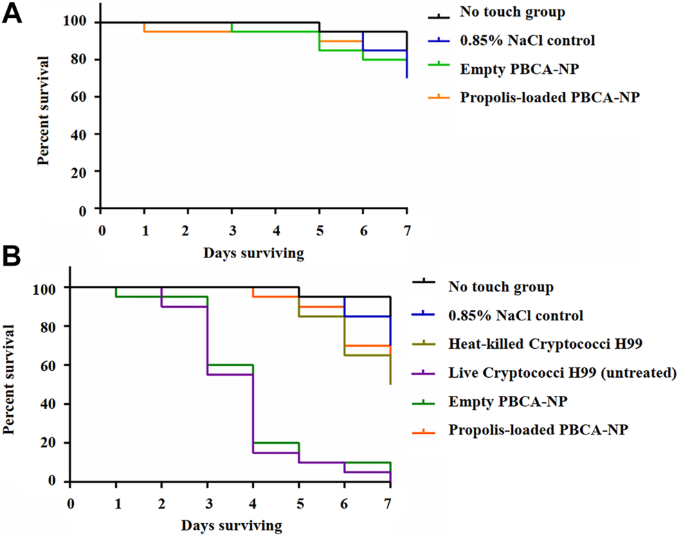 Acute toxicity was assessed by injection of 20 µL inocula of empty and propolis-loaded PBCA-NP suspensions. The toxicity of the particles was evaluated by comparing survival curves of the “no touch” and physiologic saline injected groups with the NP injected groups.