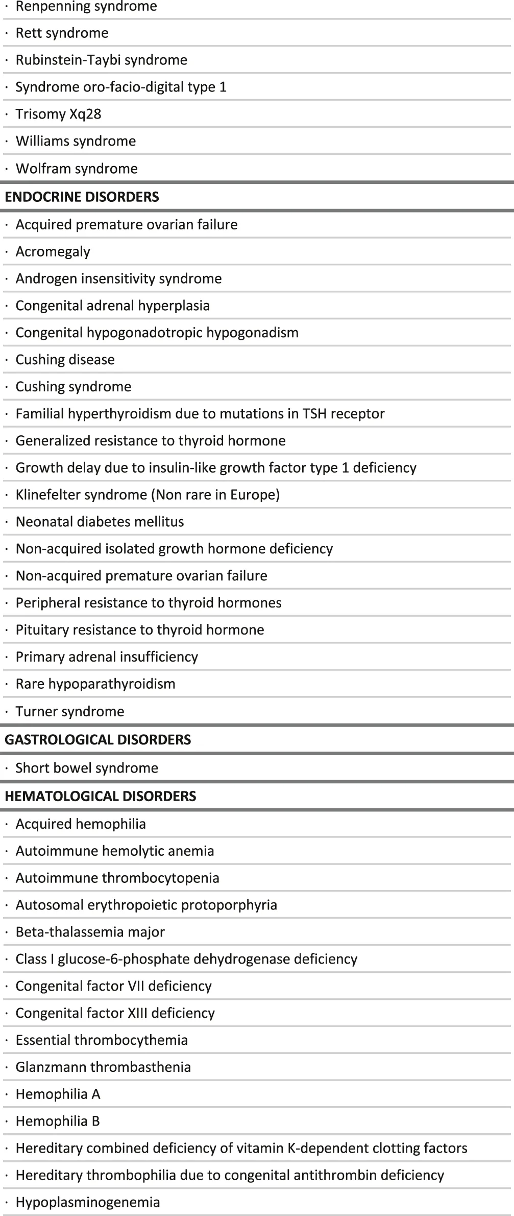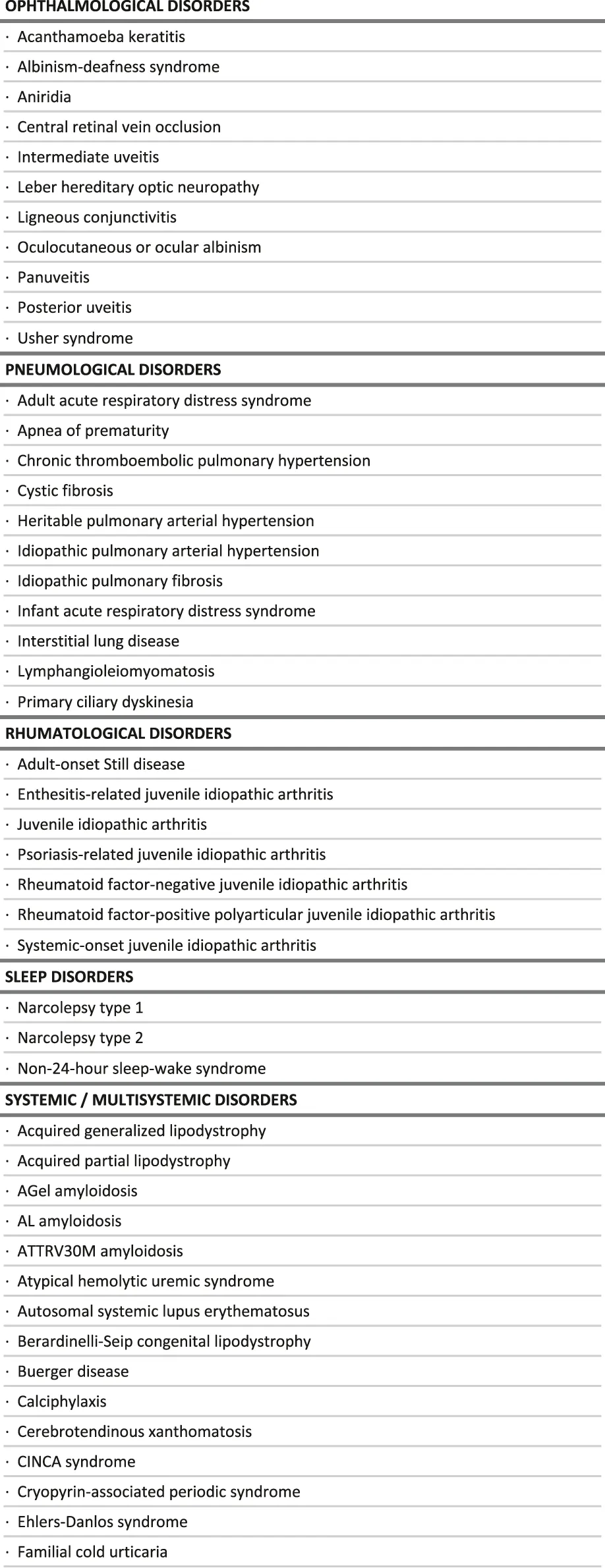 Although not affecting the final list, the proposed grouping of conditions can also be questioned, as the same disease can be considered from several angles, such as the main affected function, the medical specialty caring for patients, the pathophysiology at stake, the etiology, etc. (Rath et al., 2012; Pavan et al., 2017). For this project, it was decided to be as close as possible from the ICD 11 classification system, as it is the most recent attempt to establish an international consensus (Aymé et al., 2015). These choices are however disputable. For example, Neurofibromatosis type 1 is classified as a dermatological disease when it could be also in the developmental anomaly group. Turner and Klinefelter syndrome are considered here as endocrine disorders, when they could also be considered as developmental anomalies. Glucose-6-phosphate dehydrogenase deficiency is in the group of hematological conditions when it could be in the inborn errors of metabolism group. Alpha-1-antitrypsin deficiency is here as hepatological disease and could be a pneumological disease for instance.