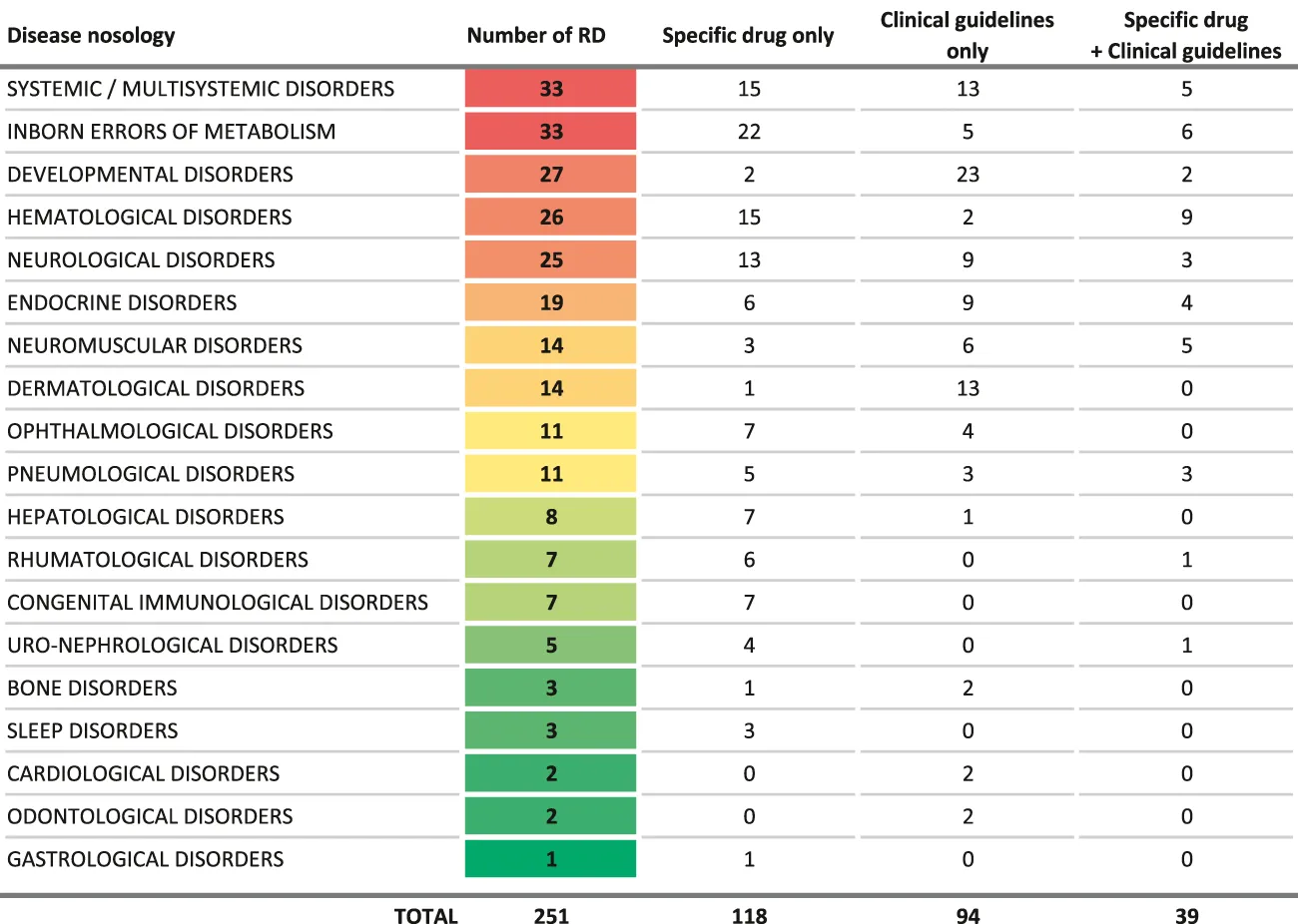 The final list includes 251 conditions, classified in broad categories (Table 1). Notably, most of the conditions identified benefit exclusively either from a drug (118 RDs) or clinical guidelines (94 RDs), while only 39 of them benefit from both (Figure 2). Without surprise, the largest groups are inborn errors of metabolism and multi-systemic diseases, followed by developmental disorders, hematological disorders and neurological disorders. Developmental disorders are well represented because of the large number of clinical guidelines available, despite a small number of drug therapies (Table 2). On the contrary, inborn errors of metabolism rank high because of the large number of marketed drugs, despite a small number of clinical guidelines. In all categories, the number of RDs with both a marketed drug and clinical guidelines is very small (15%).