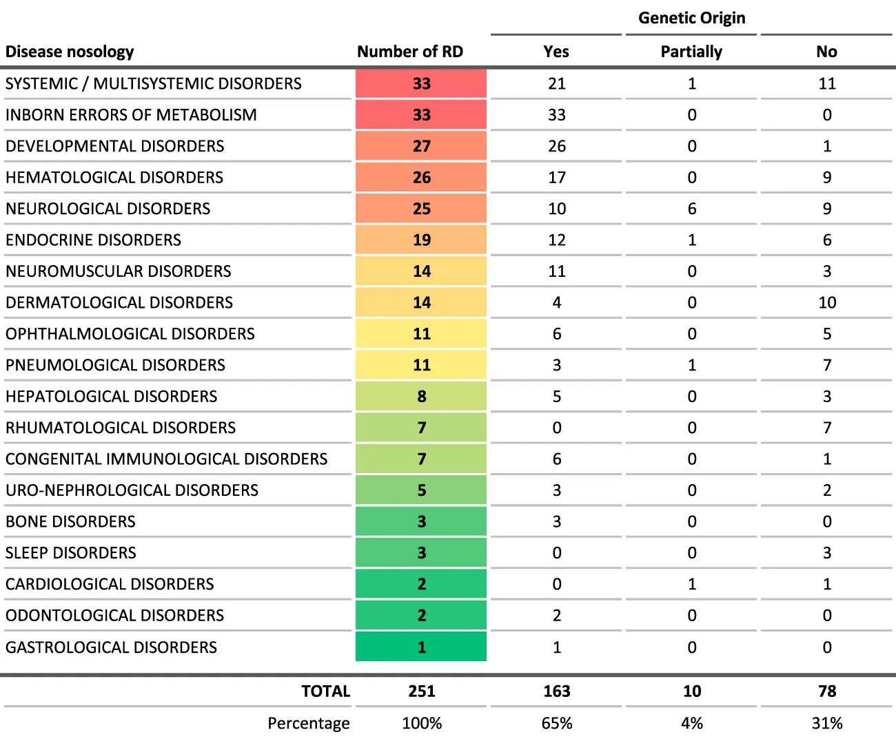 The inheritance codes were simplified in three categories: “Genetic origin” encompasses all diseases with a genetic origin whatever the mode of inheritance. “Partially genetic” includes diseases with a mix of different possible origins, some being genetic, some being acquired. “Non genetic” includes all other diseases, although some of them may have some genetic determinants as minor co-factor. The pathologies were classified by broad categories, following the logics applied in the International Classification of Diseases in its 11th edition (Organization, World Health).