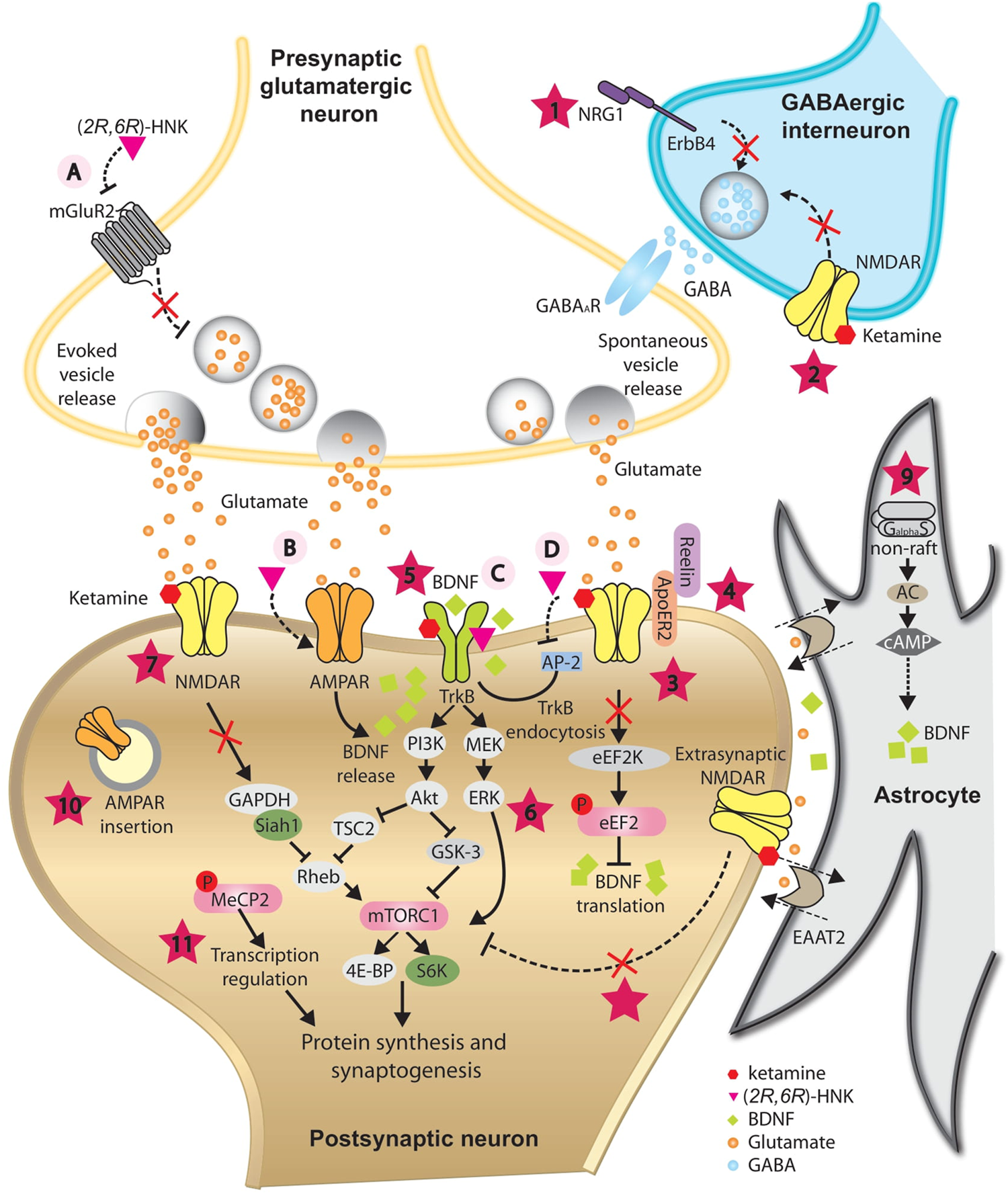 Proposed mechanisms underlying the antidepressant-like effects of ketamine and its metabolite (2R,6R)-HNK. In GABAergic inhibitory interneurons, ketamine is proposed to decrease GABA release onto glutamatergic presynaptic neurons by antagonizing NRG1/ErbB4 signaling pathway (1) and/or blockade of NMDARs (2), resulting in disinhibition of pyramidal neurons. Augmented glutamate transmission activates AMPARs and subsequently enhances BDNF release. In postsynaptic neurons, ketamine is proposed to augment BDNF/TrkB pathway by releasing the inhibition of BDNF translation from eEF2K (3), directly binding with its receptor TrkB (5), and/or by activating the PI3K-Akt and MEK-ERK signaling pathways (6). One of the downstream targets activated via PI3K-Akt and MEK-ERK signaling pathways is mTORC1, which is implicated in synaptogenesis- and synaptic plasticity-relevant processes. Besides direct activation by BDNF/TrkB signaling, blockade of NMDARs by ketamine is proposed to activate mTORC1 indirectly through compromising the ubiquitin-mediated degradation of mTORC1 activator Rheb (7), or by inhibition of extrasynaptic NMDARs (8). At rest, spontaneous vesicle release may play an important role in maintaining the activation of NMDARs at basal level. Reelin/ApoER2 may be implicated in this process and be modulated by ketamine (4). Inhibition of NMDAR by ketamine blockade may promote AMPAR insertion at postsynaptic sites as a homeostatic process (10). BDNF/TrkB signaling pathway may trigger phosphorylation of MeCP2, which is essential for sustained antidepression-like action of ketamine (11). In astrocyte, ketamine is proposed to trigger the translocation of Gas to non-raft domains, leading to enhanced AC activity and elevated BDNF expression (9). (2R,6R)-HNK may act on the presynaptic terminal to increase glutamate release, possibly via inhibition of mGluR2 receptors (A). Elevated glutamate release may activate postsynaptic AMPARs and enhance BDNF release (B). (2R,6R)-HNK may also facilitate the BDNF/TrkB signaling pathway by directly binding with TrkB (C), or by disrupting the interaction between TrkB and AP-2, thus inhibiting the endocytosis of TrkB (D). These mechanisms may have different temporal spatial features and may function synergistically or complementarily, leading to a rebalanced excitatory/inhibitory neurotransmission and restored integrity of neural circuits, which is indispensible for the antidepressant-like action of ketamine and (2R,6R)-HNK.