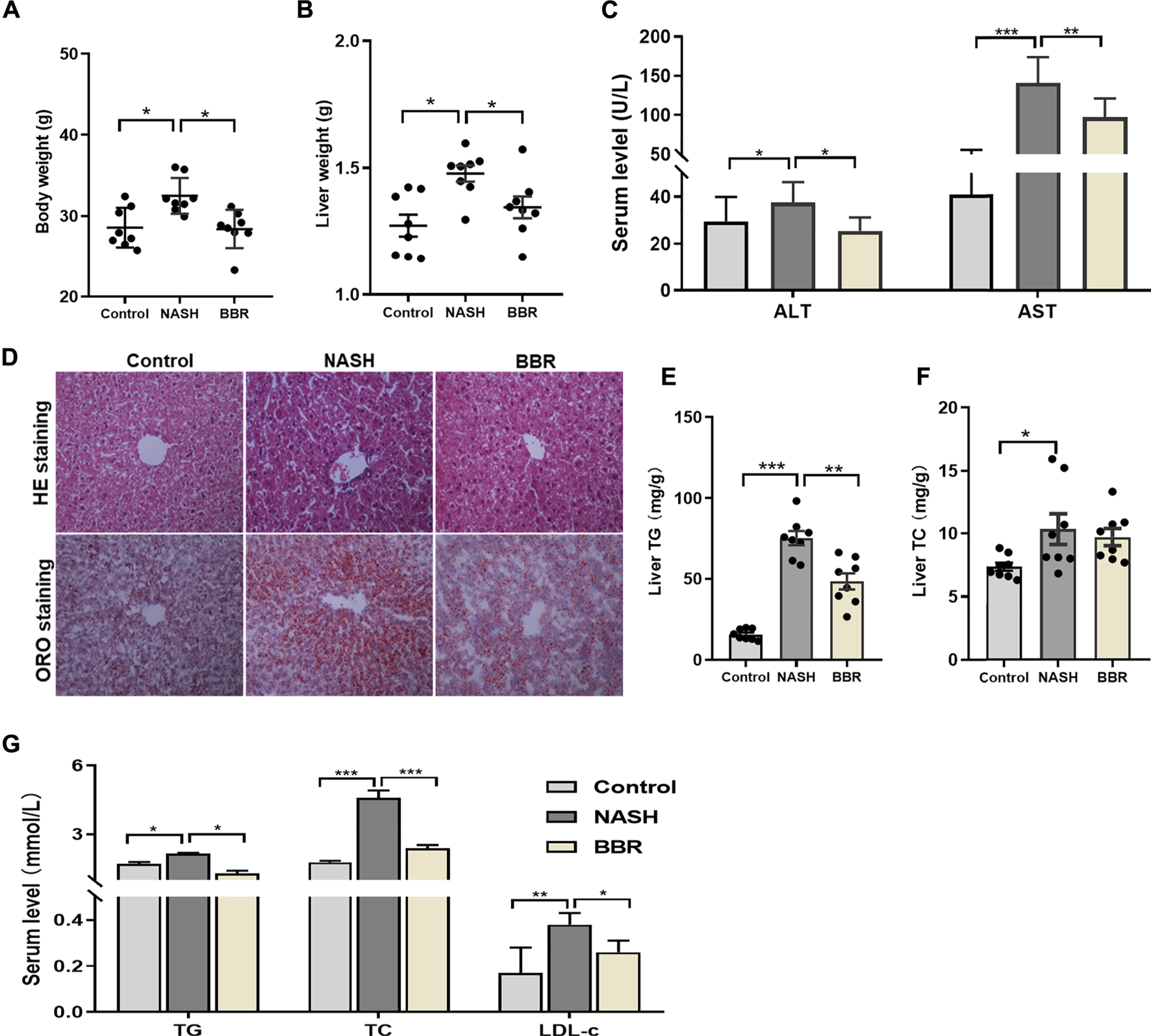 Effects of BBR on HFD-DSS induced NASH mice. (A) Body weight; (B) Liver weight; (C) Serum ALT and AST levels; (D) Representative H&E and ORO staining images of liver sections (magnification 200×); (E,F) Liver TG and TC content; (G) Serum TG, TC and LDL-c levels. Data are expressed as mean ± SEM, eight animals are allocated for each group. *p < 0.05, **p < 0.01; ***p < 0.001 between groups.