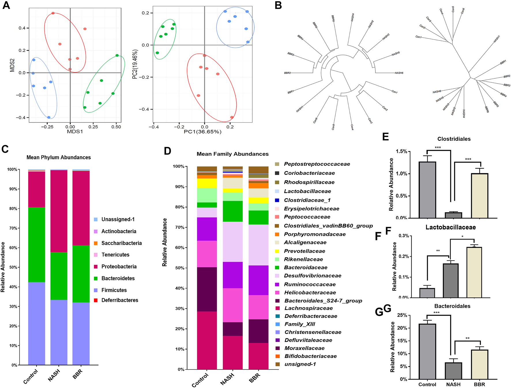 BBR reshapes gut microbiota in NASH mice. (A) PCoA analysis based on the unweighted UniFrac analysis of OTUs; (B) Bray-Curtis distance analysis of OTUs; (C) Mean phylum abundance of OTUs; (D) Mean family abundance of OTUs; (E–G) The relative abundance of Clostridiales, Lactobacillaceae and Bacteroidaies. Data are expressed as mean ± SEM of six animals per group. *p < 0.05, **p < 0.01; ***p < 0.001 between groups.