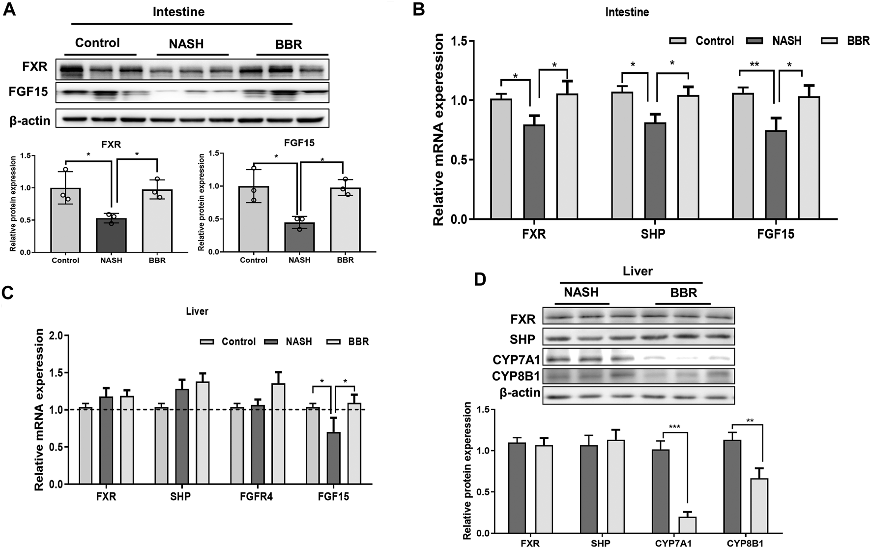 BBR regulates FXR signaling in NASH mice. (A) The protein expression of intestinal FXR and FGF15, and (B) the mRNA expression of FXR, SHP and FGF15. (C) Liver mRNA expression of FXR, SHP, FGFR4 and FGF15. (D) The protein expression of FXR, SHP, CYP7A1 and CYP8B1 between NASH mice and BBR treated mice. Data are presented as mean ± SEM (n = 3 per group). *p < 0.05, **p < 0.01, ***p < 0.001 between groups.
