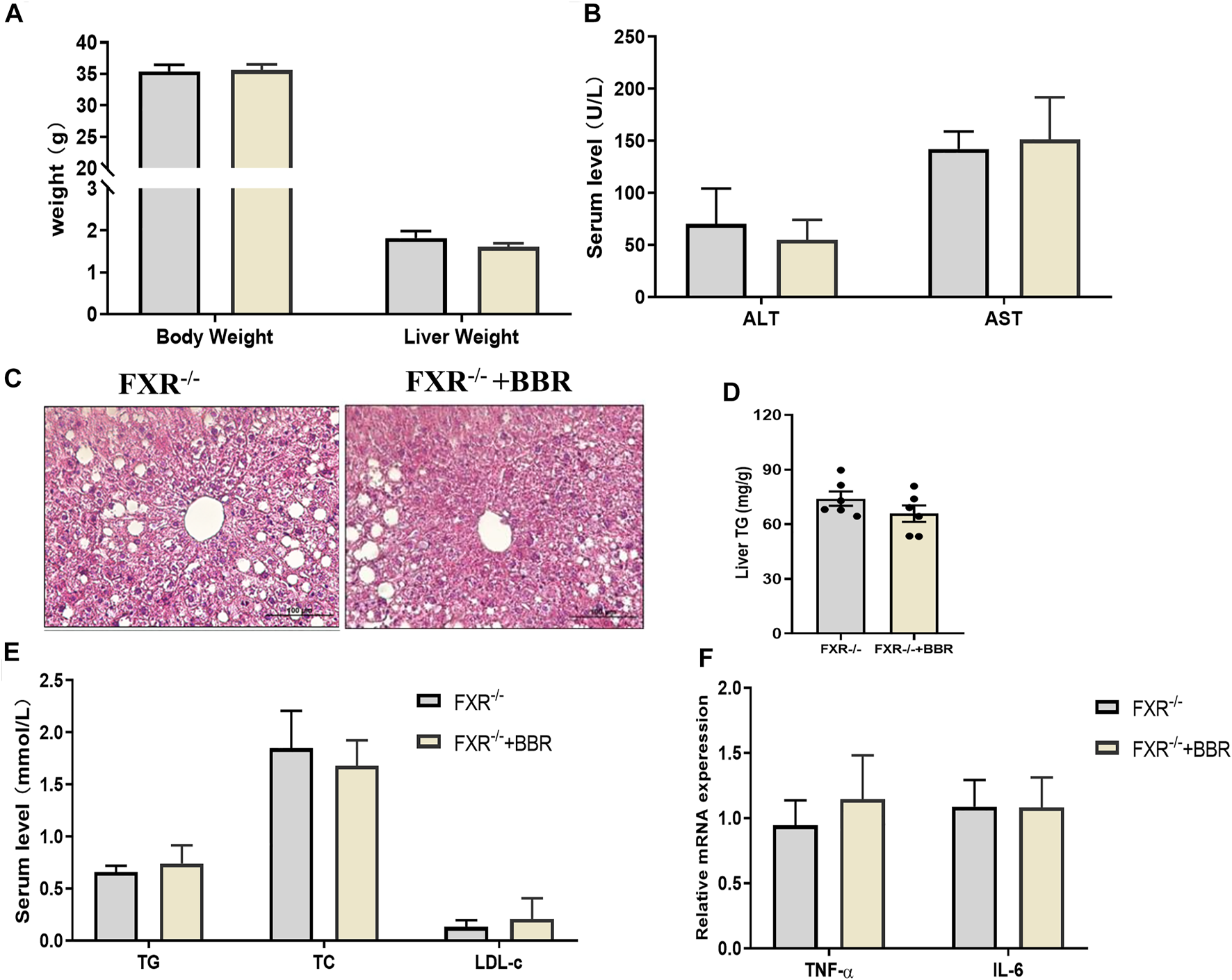 The effect of BBR on FXR−/− mice. (A) The body weight and liver weight. (B) Serum ALT and AST levels. (C) Representative H&E staining images of liver sections (magnification 200×). (D) Liver TG content. (E) Serum TG, TC and LDL-c levels. (F) The mRNA expression of TNF-α and IL-6 in the liver. Data are presented as mean ± SEM (n = 6 per group).