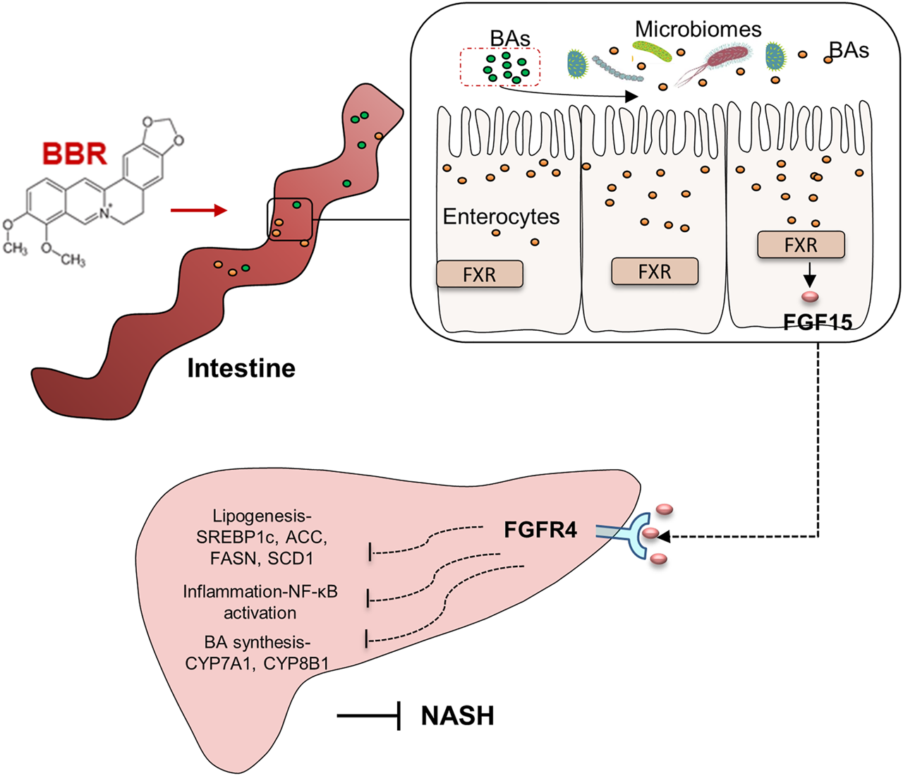 In the present study, we show that BBR administration potently improves hepatic steatosis and reduces infiltration of inflammatory cells in the liver of NASH mice. Applying 16S ribosomal DNA (16SrDNA)-based microbiota analysis and BA profiling, we demonstrate that BBR treatment remodels the structure of gut microbiota and alters the composition of BA species in NASH mice. The increase of certain BA species, e.g., deoxycholic acid (DCA), chenodeoxycholic acid (CDCA) in the intestine might activate FXR-fibroblast growth factor 15 (FGF15) axis, and further suppresses lipogenesis and inflammation in the liver. We also demonstrate that the beneficial effects of BBR are abolished in FXR knock-out mice. These findings thus suggest that intestinal FXR activation is one of the underlying mechanisms of BBR on NASH mice.
