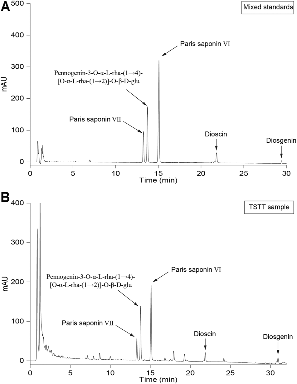 The HPLC graph of mixed standards (A) and TSTT (B).
