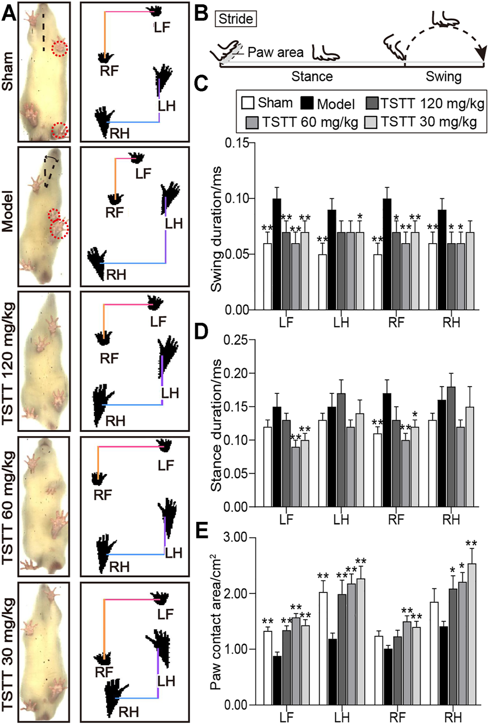 TSTT ameliorated gait impairments in the CatWalk test of rats on 30th day after pMCAO. (A) Gait changes of model group rats were characterized by body imbalance and limb asymmetry. (B) The time elapsed of one complete stride comprised of the swing duration and stance duration. Quantitative analysis of (C) swing duration, (D) stance duration and (E) paw contact area of LF (left-front paw), LH (left-behind paw), RF (right-front paw) and RH (right-behind paw). *p < 0.05, **p < 0.01 vs. model group.