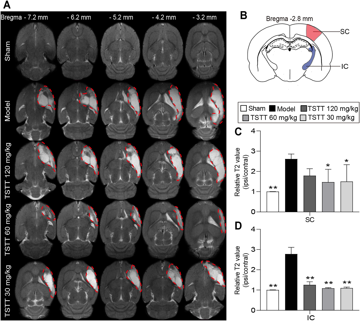 TSTT alleviated brain tissues injuries of rats on 31st day after pMCAO. (A) Representative axial T2WI images obtained from sham, model, TSTT (120, 60, and 30 mg/kg) group rats from bregma −7.2 mm to −3.2 mm (Abnormal T2 hyperintensities were depicted by red dashed). (B) Schematic illustration of sensorimotor cortex (SC, red) and internal capsule (IC, blue) of rat brain diagram. The relative T2 relaxometry values in (C) SC and (D) IC were automatically collected, respectively. **p < 0.01, *p < 0.05 vs. model group.