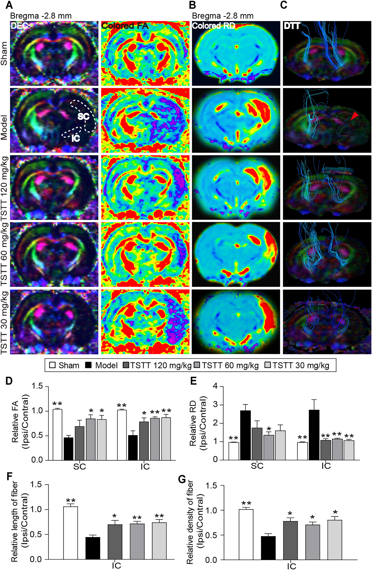 TSTT preserved microstructure of axon and myelin sheath of rats on 31st days after pMCAO. (A) Representative directional encoded color (DEC) and colored fractional anisotropy (FA) were obtained from sham model, TSTT (120, 60, and 30 mg/kg) group (White dash indicated the sensorimotor cortex (SC) and internal capsule (IC) regions in the left column). (B) Typical radial diffusivity (RD) maps (bregma −2.8 mm). (C) Reconstructed diffusion tensor tractography (DTT) images (Red arrowhead indicated ruptured and sparse fibers of the model group rats). Quantitative analysis of (D) rFA and (E) rRD values in the SC and IC of each group rats. The relative (F) length and (G) density of fibers in IC were calculated. *p < 0.05, **p < 0.01 vs. model group.