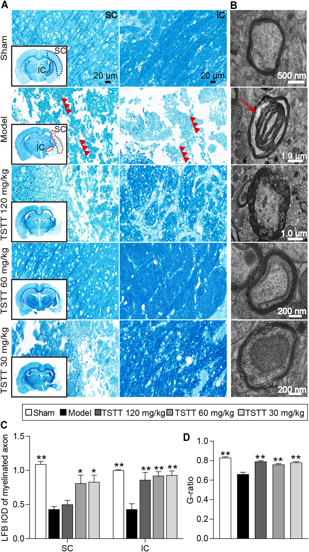 TSTT preserved myelinated axons and myelinated axons of rats on 31st day after pMCAO. Photomicrographs of tissues obtained in the brain sensorimotor cortex (SC) and internal capsule (IC). (A) LFB staining characteristic images in bregma −2.8 mm are displayed (black box) and magnified in surroundings (Scale bar = 20 μm, 40 × magnification). The vacuolation and fragments of myelinated axonal fiber were pointed out by red triple-arrowheads. (B) Representative TEM images for ultrastructure of axons and myelin sheath (Red arrow indicated myelin sheath splitting from axons). Quantitative analysis of (C) LFB IOD of myelinated axon in SC, IC (n = 4) and (D) the G-ratio (n = 2). *p < 0.05, **p < 0.01 vs. model group.