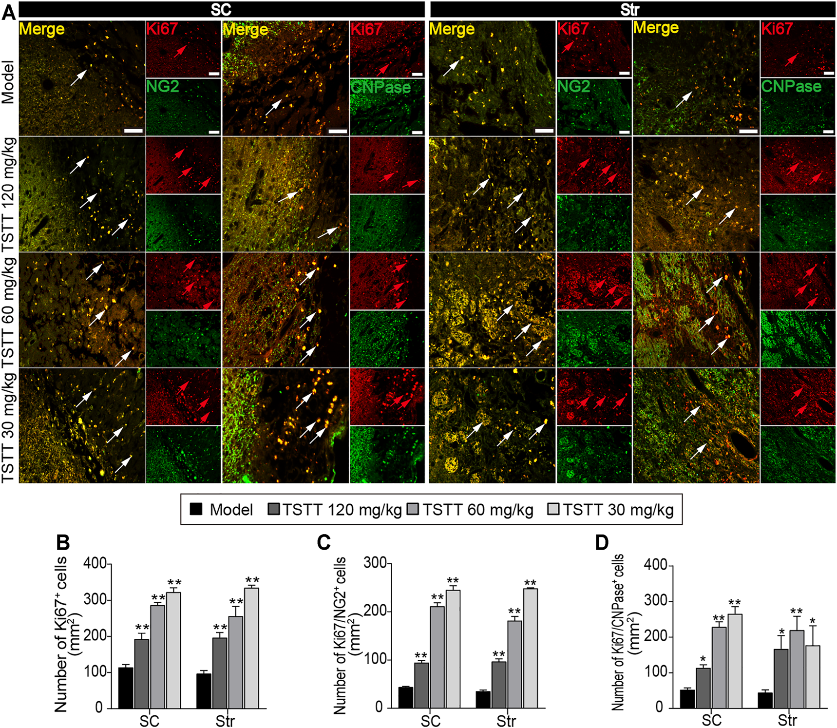 TSTT promoted perilesional oligodendrogenesis of rats on 31st days after pMCAO. (A) Typical immunofluorescent images of Ki67+ with NG2+ and CNPase+ were captured from the perilesional sensorimotor cortex (SC) and striatum (Str) (red arrowhead indicated Ki67+ cells, white arrowhead indicated co-localized cells). Quantitation of the number of (B) Ki67+, (C) Ki67+/NG2+, and (D) Ki67+/CNPase+ cells per mm2 in the perilesional SC and Str. Scale bar = 50 μm (n = 4). *p < 0.05, **p < 0.01 vs. model group.