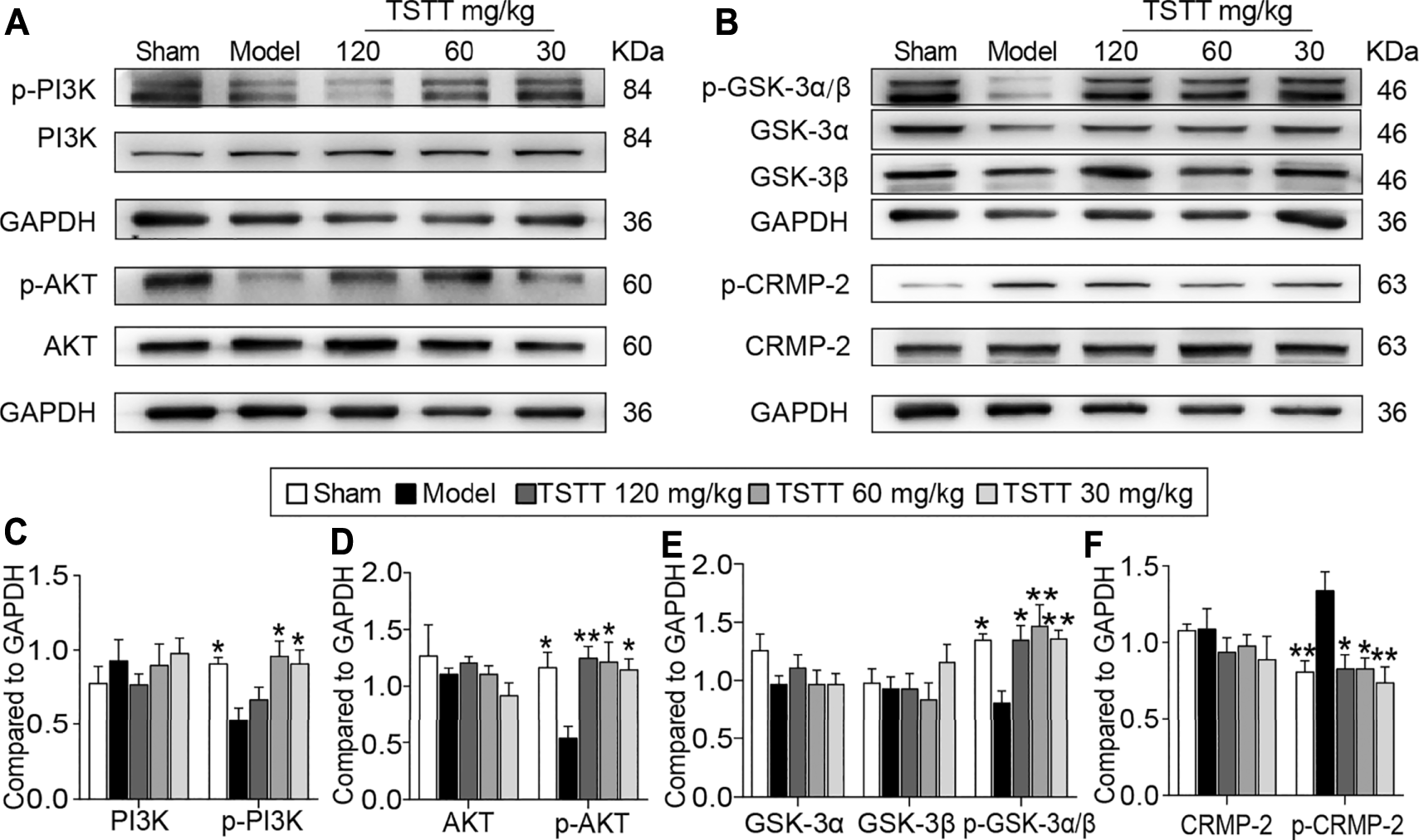 TSTT activated the PI3K/Akt/GSK-3/CRMP-2 pathway in rats on 31st day after pMCAO. (A) The representative bands of p-PI3K (Tyr 467/Tyr 199), PI3K, p-AKT (Ser 473) and AKT. (B) Typical protein blot of pGSK-3α/β (Ser 21/9), GSK-3α, GSK-3β, p-CRMP2 (Thr 514) and CRMP2. Quantitative analysis for protein expressions of (C) p-PI3K and PI3K, (D)p-AKT and AKT, (E) pGSK-3α/β, GSK-3α and GSK-3β, (F)p-CRMP-2 and CRMP-2 (n = 4). *p < 0.05, **p < 0.01 vs. model group.