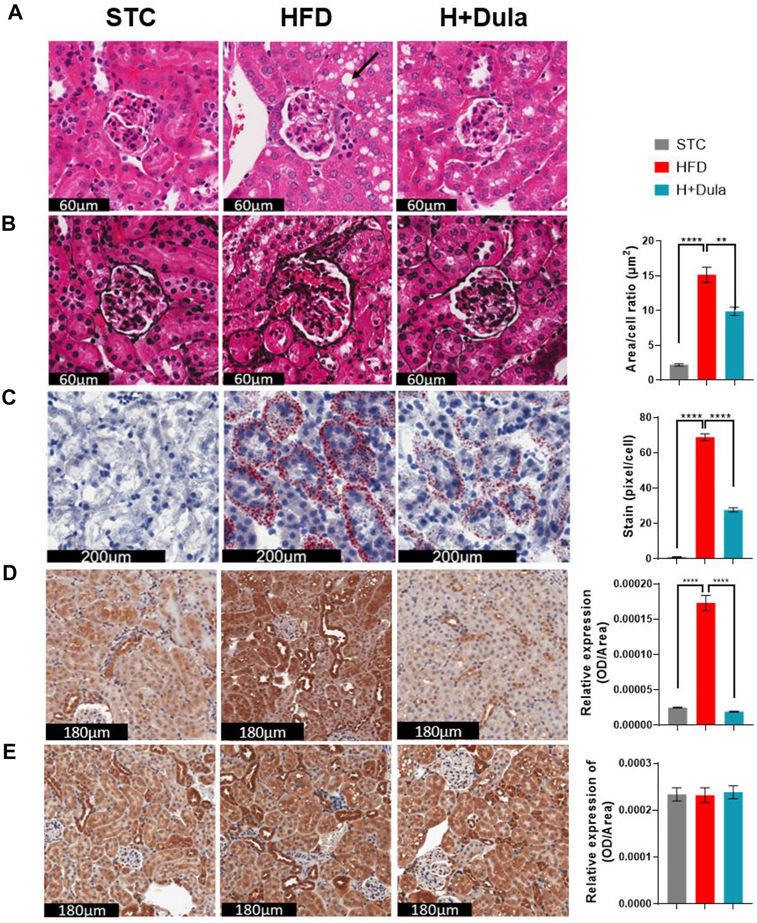 We also performed histological examination and revealed that the kidney of high-fat diet-fed mice developed vacuolization of renal tubules, same as that observed in obese patients with DKD (Figure 2A, black arrow) (Liptak and Ivanyi, 2006; Watanabe et al., 2021). Reduction in the area of vacuolization was observed in the H + Dula group as compared to the HFD group (Figure 2A). PASM staining showed mesangial expansion, enlargement of the glomerular tuft, and thickening of the tubular basement membrane in the HFD group as compared with the STC group, and the area showed a significant reduction in size after dulaglutide treatment (Figure 2B).