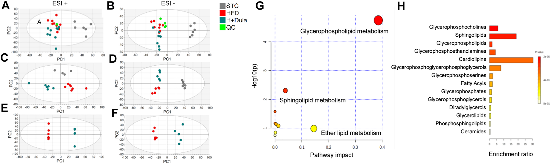 Bioinformatics analysis of lipidomics of the kidneys of STC, HFD and H + Dula groups (A–F) The score plots from PCA, PLS-DA and OPLS-DA model between the HFD and the H + Dula group. UHPLC/ESI-QTOF-MS in positive and negative electrospray ionization mode were used. (A,B) PCA score plot, (C,D) PLS-DA score plot and (E,F) OPLS-DA score plot of lipids from UHPLC/ESI-QTOF-MS in positive and negative mode, respectively. Positive PLS-DA score plot: R2X(cum) = 0.534, R2Y(cum) = 0.990, Q2(cum) = 0.792; negative PLS-DA score plot: R2X(cum) = 0.561, R2Y(cum) = 0.990, Q2(cum) = 0.885. Positive OPLS-DA score plot: R2X(cum) = 0.563, R2Y(cum) = 0.999, Q2(cum) = 0.706; negative OPLS-DA score plot: R2X(cum) = 0.414, R2Y(cum) = 0.975, Q2(cum) = 0.614. (G) Summary of renal lipidomic pathways of high-fat diet-fed mice altered by dulaglutide treatment. Each point represents one lipidomic pathway. The size of dot and the shade of color are positively related to the effect on the lipidomic pathway. (H) Lipid sets enrichment overview of the kidneys of high-fat diet-fed mice after treatment with dulaglutide.