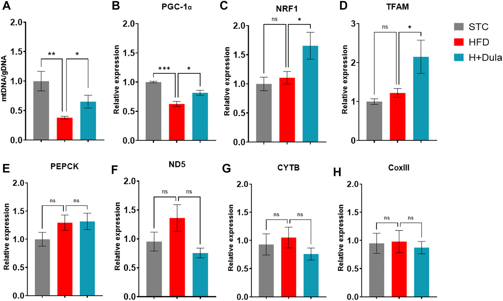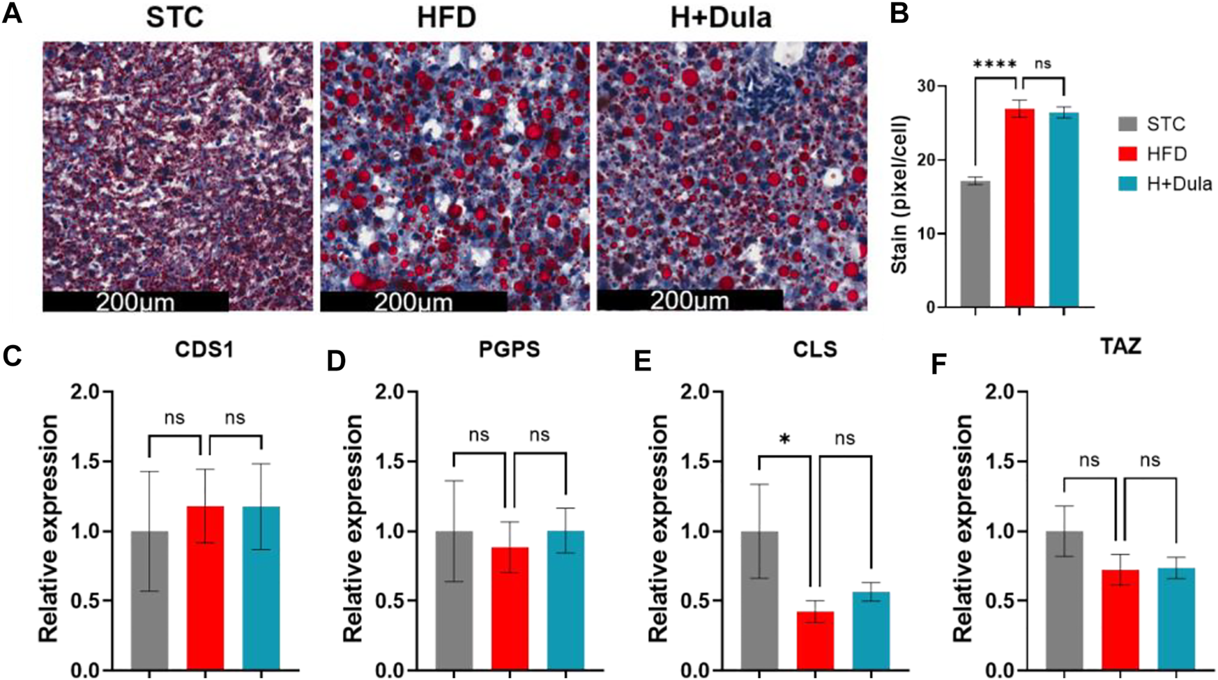 Pathway analysis was performed and identified several altered metabolic pathways in the kidneys (Figure 3G). The top altered pathway is glycerophospholipid metabolism. Previous studies demonstrated that the composition and abundance of glycerophospholipids are changed in the serum and muscle of obese mice with T2DM (Rauschert et al., 2016; Wolfgang, 2021). As glycerophospholipids can undergo esterification with amino acids to form a range of glycerophospholipid subtypes, unbiased lipid set enrichment analysis was performed to screen for differently expressed lipids. Intriguingly, an essential constituent of the inner mitochondrial membrane lipid, cardiolipin, shows the highest enrichment (Figure 3H). As the above analyses did not provide any information for their relative levels, we further analyzed the changes in the level of each lipid species in the HFD and H + Dula groups. In short, we identified 62 lipids of interest and listed their details in Table 1. In brief, there was reduced abundance of most identified species for diacylglycerols (DG), phosphatidic acids (PA), phosphatidylglycerols (PG), and triglycerides (TG) in the kidney of the H + Dula group. Unexpectedly, the levels of a number of lipid species were remarkably increased in the H + Dula group, such as all identified ceramides (Cer), four out of five cardiolipin species (CL), and eight out of nine phosphatidylethanolamine species (PE).
