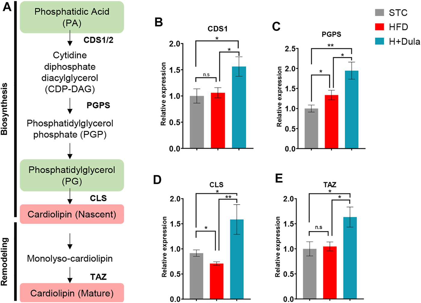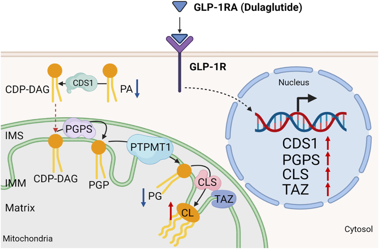 With the advancement in mass spectrometry technology (Ellis et al., 2007; Nam et al., 2015; Liu et al., 2019), we used untargeted lipidomic approaches to comprehensively unravel the changes in lipid contents of the diet-induced kidney damage from obese mice after treatment of a GLP-1RA dulaglutide and hence to explore the underlying mechanisms for its renoprotective effect. In this report, we presented the evidence that dulaglutide protects renal function by elevating the level of a unique mitochondrial inner membrane phospholipid, cardiolipin, in the kidney cortex region via the upregulation of the mRNA expression of cardiolipin synthesis enzymes, which leads to alleviation of overnutrition-impaired kidney mitochondrial bioenergetics.