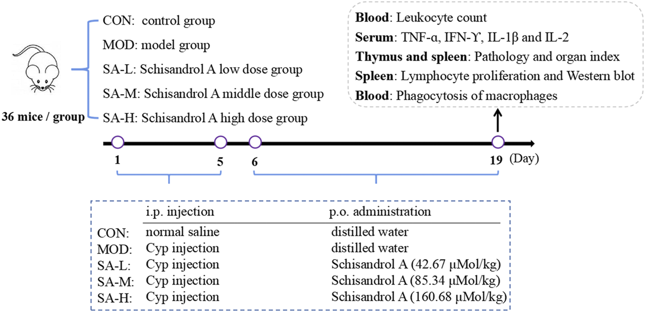 Schisandrol A (Preferred Biotechnology Co., Ltd., > 98%, Chengdu, China, No. 19110503); Cyclophosphamide (Cy) for Injection (Baxter Oncology GmbH, Halle, Germany, H20160467); Concanavalin A (Con A, type IV; Sigma-Aldrich, Merck KGaA, Darmstadt, Germany); polyclonal antibodies Jun, Trp53, and Creb1 (ABclonal, Wuhan, China; No. 3560496003, 3560238002, and 0003310201); electrogenerated chemiluminescence (ECL) color liquid (Biyuntian Biological Products Co., Ltd., Shanghai, China, No. 9966444330).