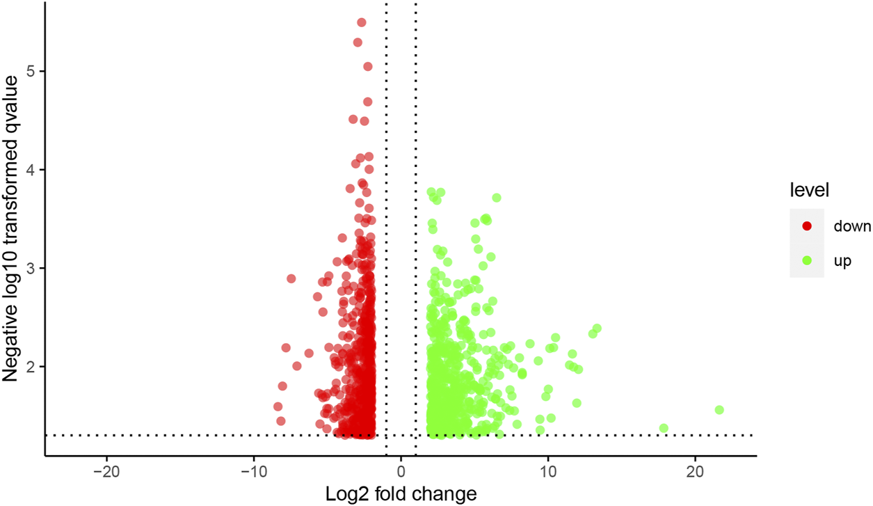 The volcano figure of mRNA expression profile microarray. Notes: Red dots indicate up-regulation genes, green dots indicate down-regulation genes.