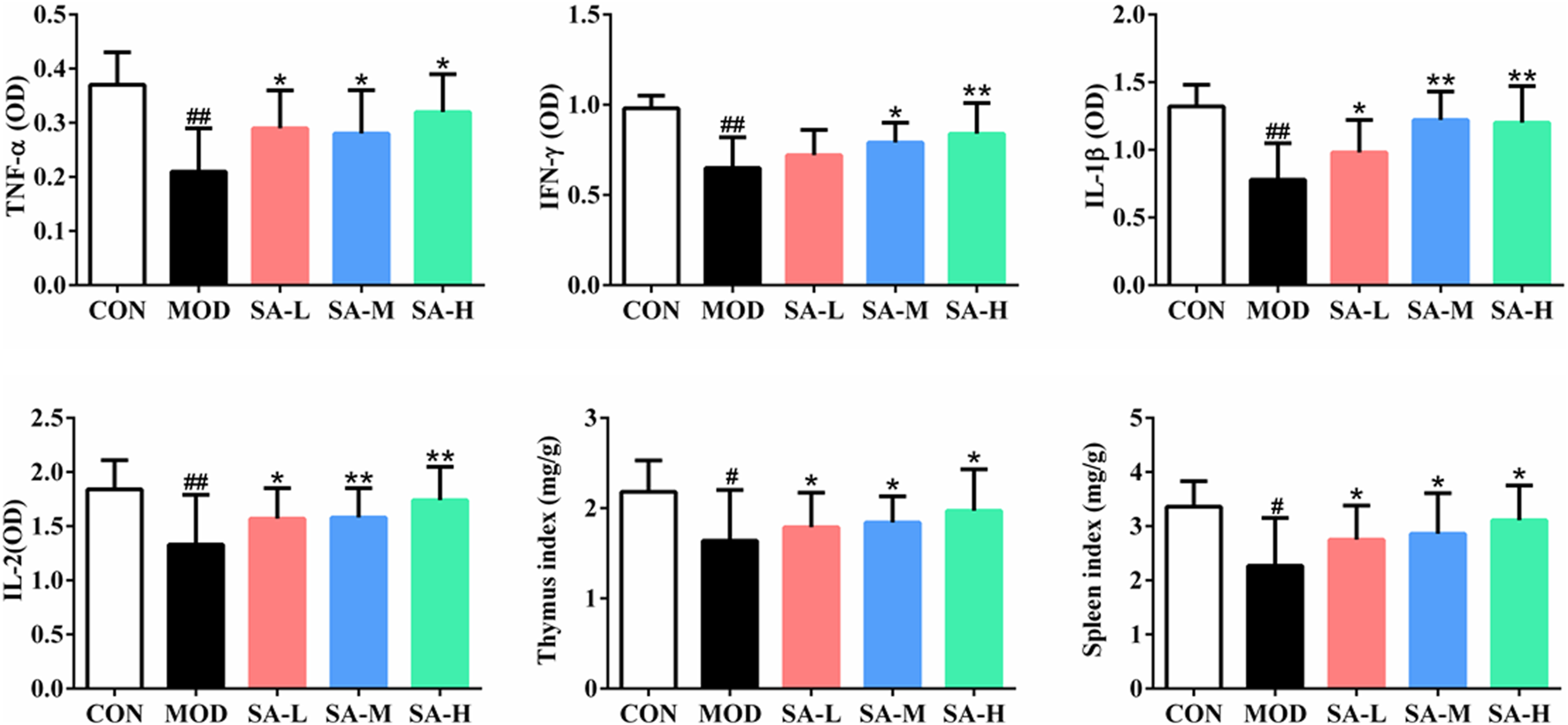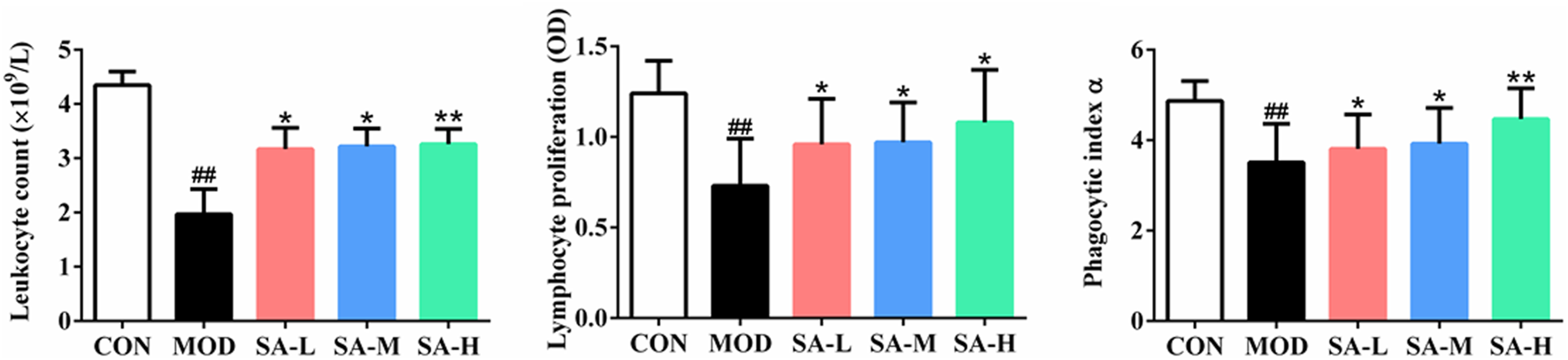 At present, immune system diseases have become the main diseases endangering human health, and the research and development of immunity-enhancing drugs are becoming increasingly important. In this study, the effect of SA on the immune function of mice and its mechanism were investigated in cyclophosphamide-induced immunosuppressive mice. Cyclophosphamide, a classical immunosuppressant, can reduce the proliferation of lymphocytes and the levels of TNF-α, IFN-γ, IL-1β, and IL-2 to cause immune function disorders. It can be seen from the experimental results of this study that SA can significantly increase the immune organ indices and the number of white blood cells, improve the proliferation of lymphocytes and the phagocytosis of macrophages, and elevate the level of immune factors of immunosuppressive mice induced by cyclophosphamide.
