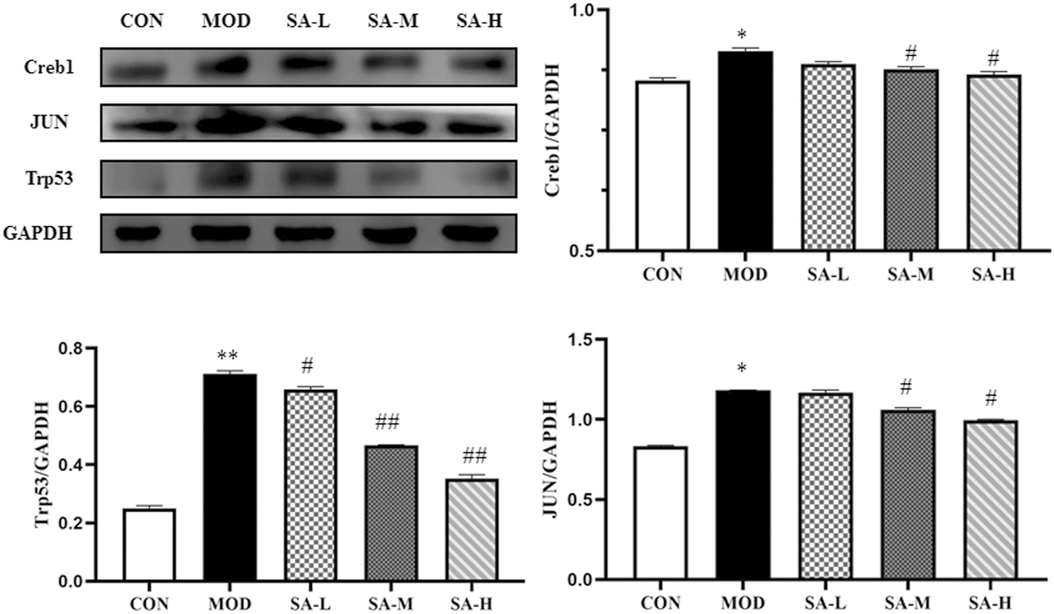 Effects of SA on the expression of Jun, Trp53 and Creb1 proteins. Notes: Groups: CON, control group; MOD, model group; SA-L, Schisandrol A low-dose group; SA-M, Schisandrol A medium-dose group; SA-H, Schisandrol A high-dose group. All the values were expressed as mean ± standard deviation (n = 3). *: p < 0.05, vs. CON; **: p < 0.01, vs. CON; #: p < 0.05, vs. MOD; ##: p < 0.01, vs. MOD.
