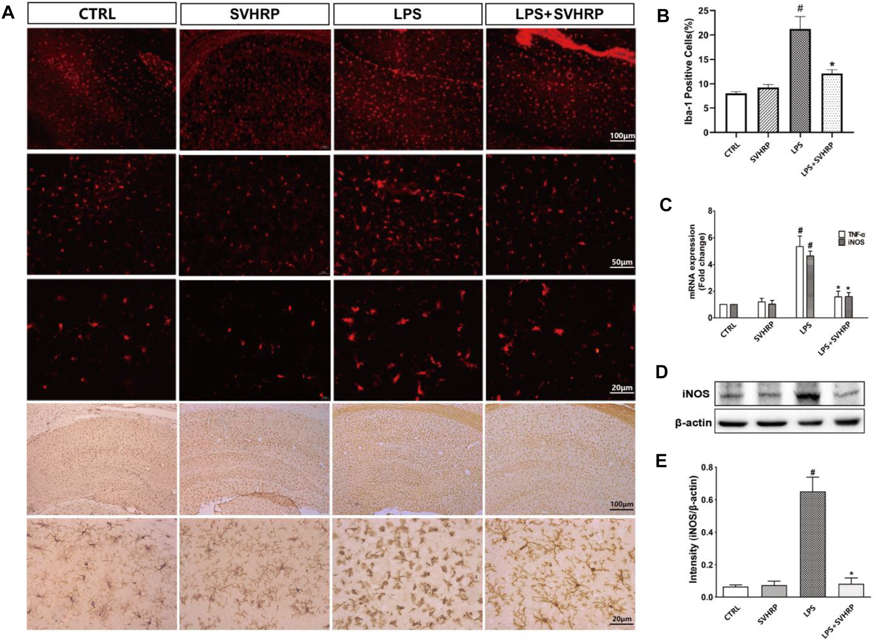 SVHRP inhibits inflammagen-induced microglia activation and inflammatory response in hippocampus. Mice were injected with SVHRP (LPS + SVHRP or SVHRP group, 125 µg/5 ml/kg, i.p.) or NS (LPS or CTRL group, 1 ml/kg, i.p.) for 3 days before and 1 day after LPS treatment (5 mg/kg, i.p.) before the mouse brains were harvested for immuno-staining for Iba-1. (A) Representative images of Iba-1 staining (IF staining, upper three panels and IHC staining, lower two panels) in hippocampus were demonstrated. (B) The average percent area of Iba-1 positive staining of four groups was analyzed using the images from IHC staining. (C) mRNA expressions of TNF-α and iNOS from hippocampus were measured by real-time PCR and calculated using 2−ΔΔCT method with GAPDH as the internal reference gene. The expression of iNOS protein from hippocampus was assessed by western blot. (D) Representative blot for iNOS and (E) quantification of iNOS protein normalized to β-actin. The data were expressed as the means ± SEM (n ≥ 3 for each group). #p < 0.05 compared with CTRL group, *p < 0.05 compared with LPS group.