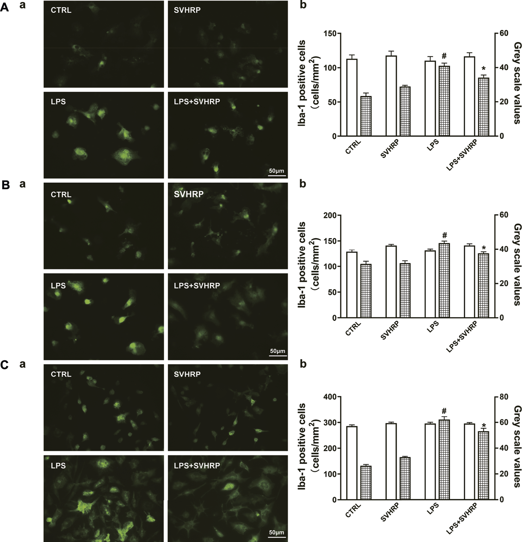 SVHRP attenuates LPS-induced upregulation of Iba-1 in microglia. IF staining for Iba-1 in primary neuron-glia (A), mixed glia (B), and enriched microglia (C) cultures were performed 24 h after LPS treatment. Cells were pretreated with vehicle or SVHRP (20 μg/ml) for 1 h before LPS challenge. (a) Representative images of Iba-1 positive cells (400×, Bar = 50 μm). (b) Cell number and average grey scale for Iba-1 staining were shown. The data were the means ± SEM (n ≥ 3 for each cell preparation). #p < 0.05 compared with CTRL group, *p < 0.05 compared with LPS group.