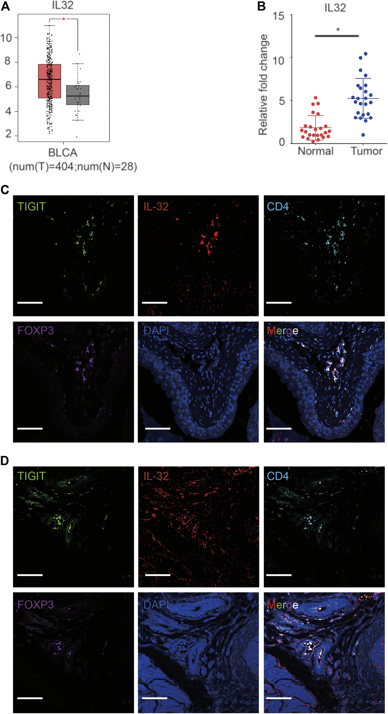 Expression of IL-32 in Treg cells in bladder cancer tissues. (A) Higher expression of IL-32 in the bladder cancer cohort in the TCGA and GTEx databases. Data are shown as the mean ± standard deviation (SD). *p < 0.05; t-test. (B) Higher relative expression of IL-32 in bladder cancer tissues. qRT-PCR analysis showing the relative expression of IL-32 in healthy and cancerous bladder tissues. Data are shown as the mean ± SD. *p < 0.05; t-test. (C) IL-32 colocalizes with Treg cells in human bladder cancer tissues. Representative immunofluorescence images showing cells stained with anti-FOXP3 (violet), IL-32 (red), CD4 (light blue), TIGIT (green), and DAPI (blue). Scale bar = 100 μm.(D) IL-32 colocalizes with Treg cells in murine bladder cancer tissues. Representative immunofluorescence images showing cells stained with anti-FOXP3 (violet), IL-32 (red), CD4 (light blue), TIGIT (green), and DAPI (blue). Scale bar = 100 μm.