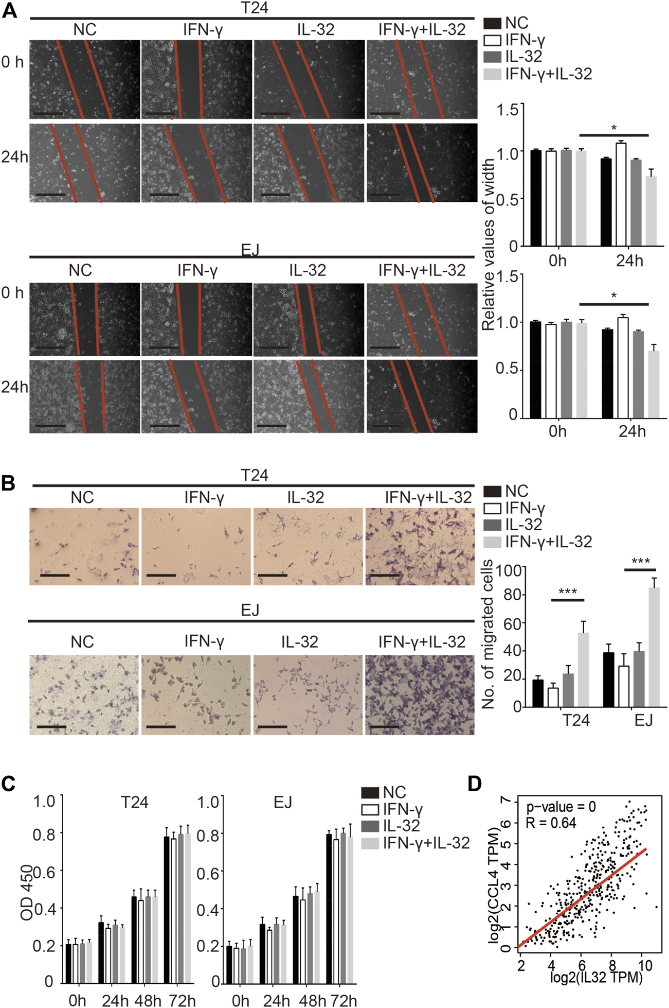 To evaluate their migration ability after treatment, T24 cells and EJ cells were seeded into six-well cell culture plates and grown in RPMI 1640 medium containing 10% FBS for 24 h to form an adherent monolayer with a degree of fusion approaching 70%–80%. A cross was scratched in the culture plate using a 200-μl sterile pipette tip, and detached cells were removed by gently washing the well twice with PBS. Fresh medium was added to the culture wells, and cells were cultured with IFN-γ (10 ng/ml) or IL-32 (10 ng/ml) for an additional 24 h. Transplanted cells were photographed (40×) using an inverted optical microscope (Zeiss) at 0 and 24 h to monitor the migration of cells to the wound area and calculate wound closure.