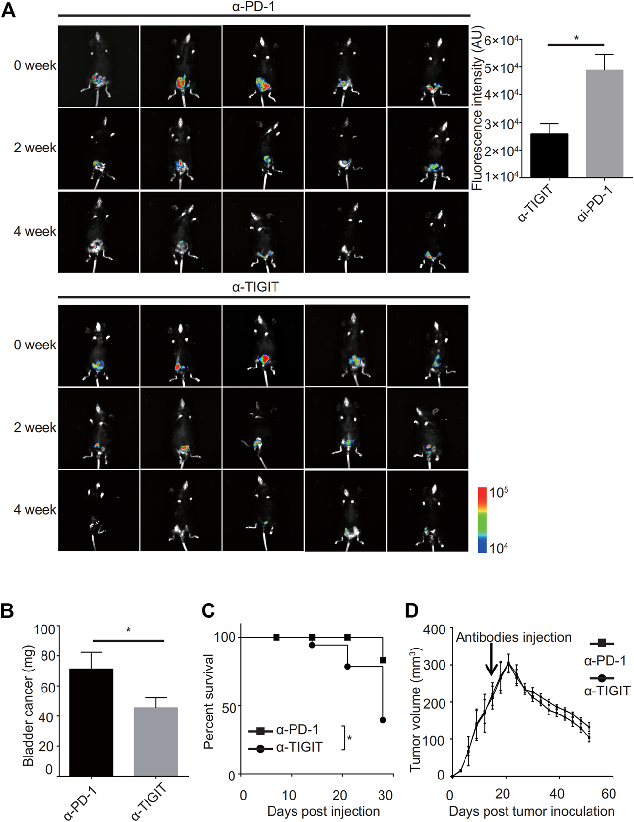 Given the good performance of the monoclonal antibody of TIGIT (α-TIGIT) against some carcinomas, we explored the antitumor capacity of TIGIT antibodies against bladder cancer. To ensure the specificity of α-TIGIT and minimize any side effects, we analyzed the distribution of TIGIT in the whole body of patients. Using the Protein Atlas database, we detected that the expression of TIGIT was higher in the urinary tract than in other tissues, except for lymphatic tissues (Supplementary Figure S2). Thus, we aimed to establish a bladder cancer orthotropic model and then compare the antitumor capacity of α-PD-1 and α-TIGIT. To visually compare the long-term efficacy of these antibodies, we established a murine model transfected with luciferase-expressing MBT-2 cells. Then, 18 days after inoculation, we intravenously administered mice with α-PD-1 or α-TIGIT (Figure 4A). We found that the tumor size in mice administered α-TIGIT was suppressed to a greater extent compared with that in mice administered α-PD-1 (Figure 4A). In addition, we observed that compared with mice injected with α-PD-1, the weights of bladders in mice administered α-TIGIT were greatly reduced (Figure 4B). Moreover, the survival rates of mice administered α-TIGIT were also higher than those of mice administered α-PD-1 (Figure 4C). Surprisingly, we did not observe any significant difference between mice administered a-TIGIT or a-PD-1 in the subcutaneous tumor model (Figure 4D). Our results clearly demonstrated that targeting TIGIT suppressed bladder cancer.
