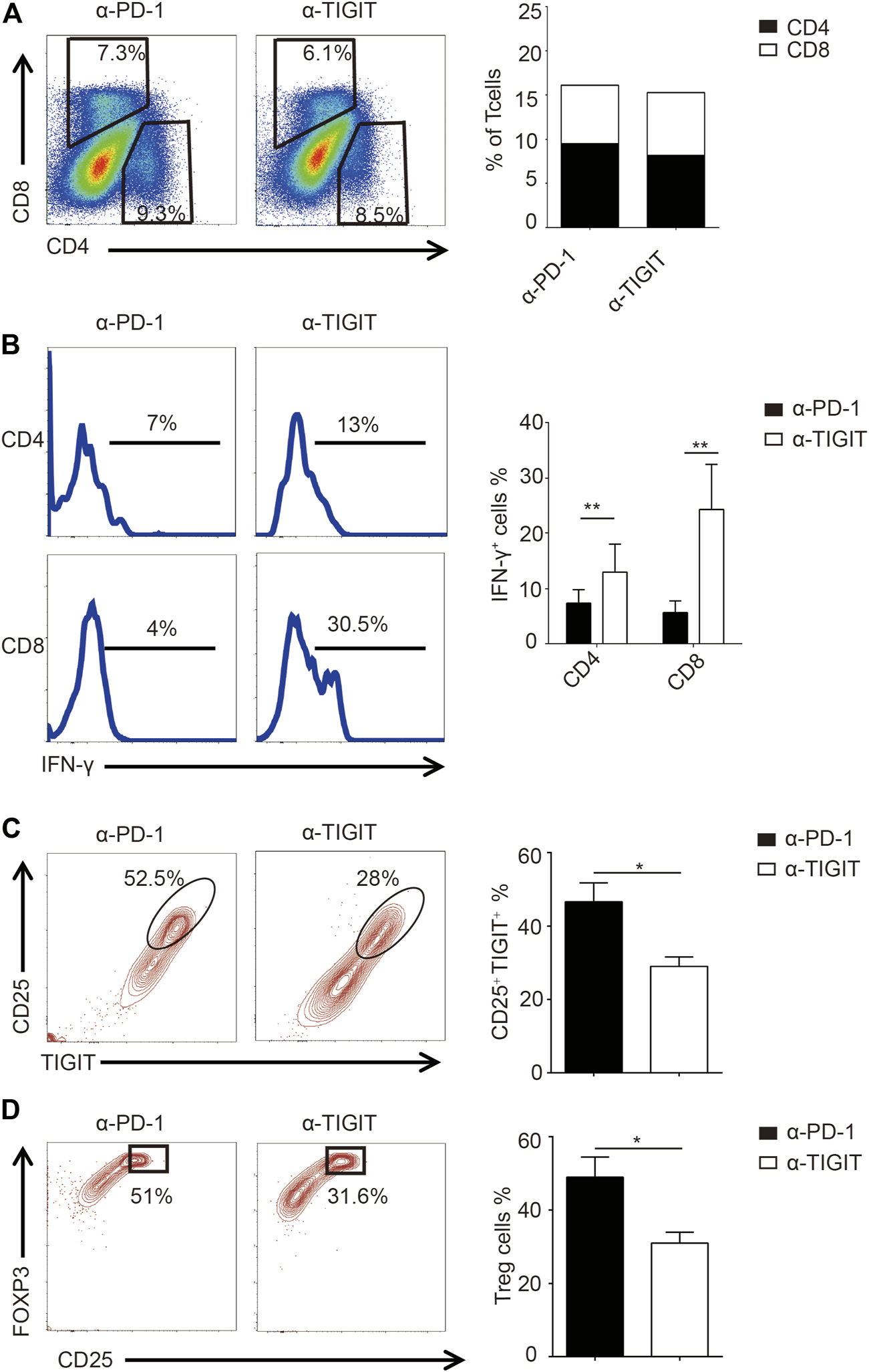 Given the efficiency of α-TIGIT against bladder cancer, we investigated the mechanisms underlying the antitumor effects of α-TIGIT. As TIGIT is known to be functionally related to the immune system, we compared the immune activities of mice administered with α-PD-1 or α-TIGIT. We noticed that the ratios of CD4+ and CD8+ T cells were not disrupted by the administration of α-PD-1 or α-TIGIT (Figure 5A). However, we found that IFN-γ was upregulated in CD4+ and CD8+ T cells of mice administered α-TIGIT compared with that in mice administered α-PD-1 (Figure 5B). As with the enhancement of the tumor-killing capacities of immune cells, the changes in immunosuppressive cells caused by the tumor microenvironment, especially the changes in Treg cells, remain unknown. To explore the regulation of α-TIGIT in Treg cells, we analyzed the expression of CD25, TIGIT, and FOXP3 in murine bladder cancer tissues. Flow cytometric analysis showed that the ratio of TIGIT+ CD25+ CD4+ T cells was downregulated in those tissues following the administration of α-TIGIT (Figure 5C). Similarly, we noticed that the ratio of Treg cells (CD25+ FOXP3+) in bladder cancer tissues was also downregulated after the administration of α-TIGIT (Figure 5D). Collectively, these data indicated that targeting TIGIT with α-TIGIT upregulated the antitumor capability of T cells, whereas it downregulated the induction of immunosuppression.