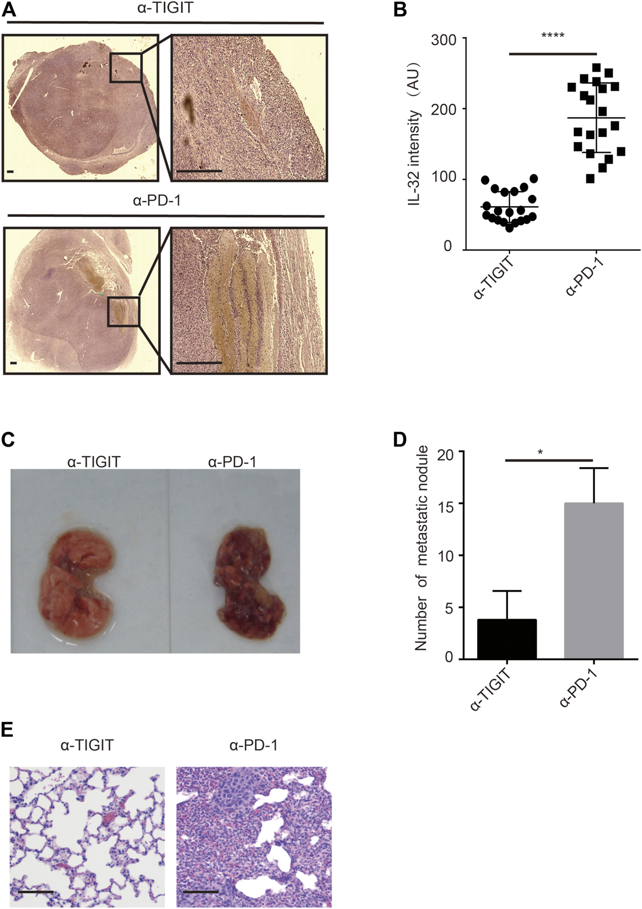 Targeting TIGIT inhibits the metastasis of bladder cancer through suppressing IL-32. (A,B) Targeting TIGIT suppresses the expression of IL-32. Immunohistochemistry images showing the expression of IL-32 in bladder tissues collected from different groups of animals. Scale bar = 1 mm (A). The levels of expression of IL-32 are shown as the mean ± SD. ****p < 0.0001; t-test (B). Data are representative of four independent experiments (n = 7). (C−E) Targeting TIGIT inhibits the metastasis of bladder cancer. Metastatic nodules in lungs of mice inoculated with bladder cancer cell lines (C). The number of metastatic nodules is shown as the mean ± SD. *p < 0.05; t-test (D). Images showing HE-stained bladder tissues collected from different groups of animals. Scale bar = 100 μm (E). Data are representative of four independent experiments (n = 7).